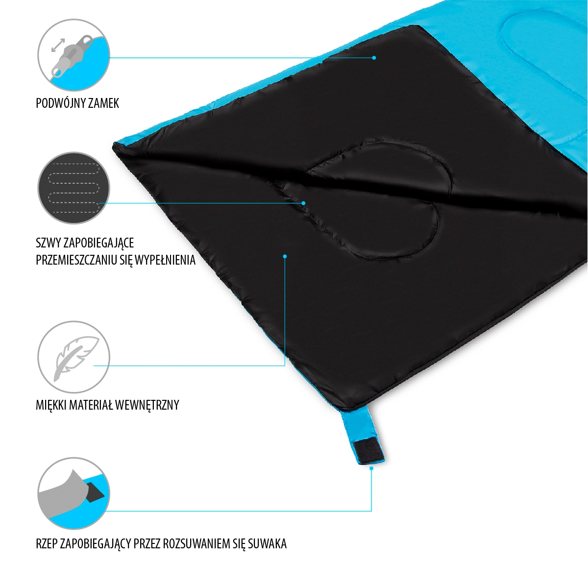 Lichte en comfortabele dekenmodel-slaapzak voor kamperen en tuin, met de mogelijkheid om volledig open te ritsen tot deken. Biedt gelijke isolatie, een tweerichtingsrits met vergrendeling en slijtvaste materialen tegen kou en vocht.
