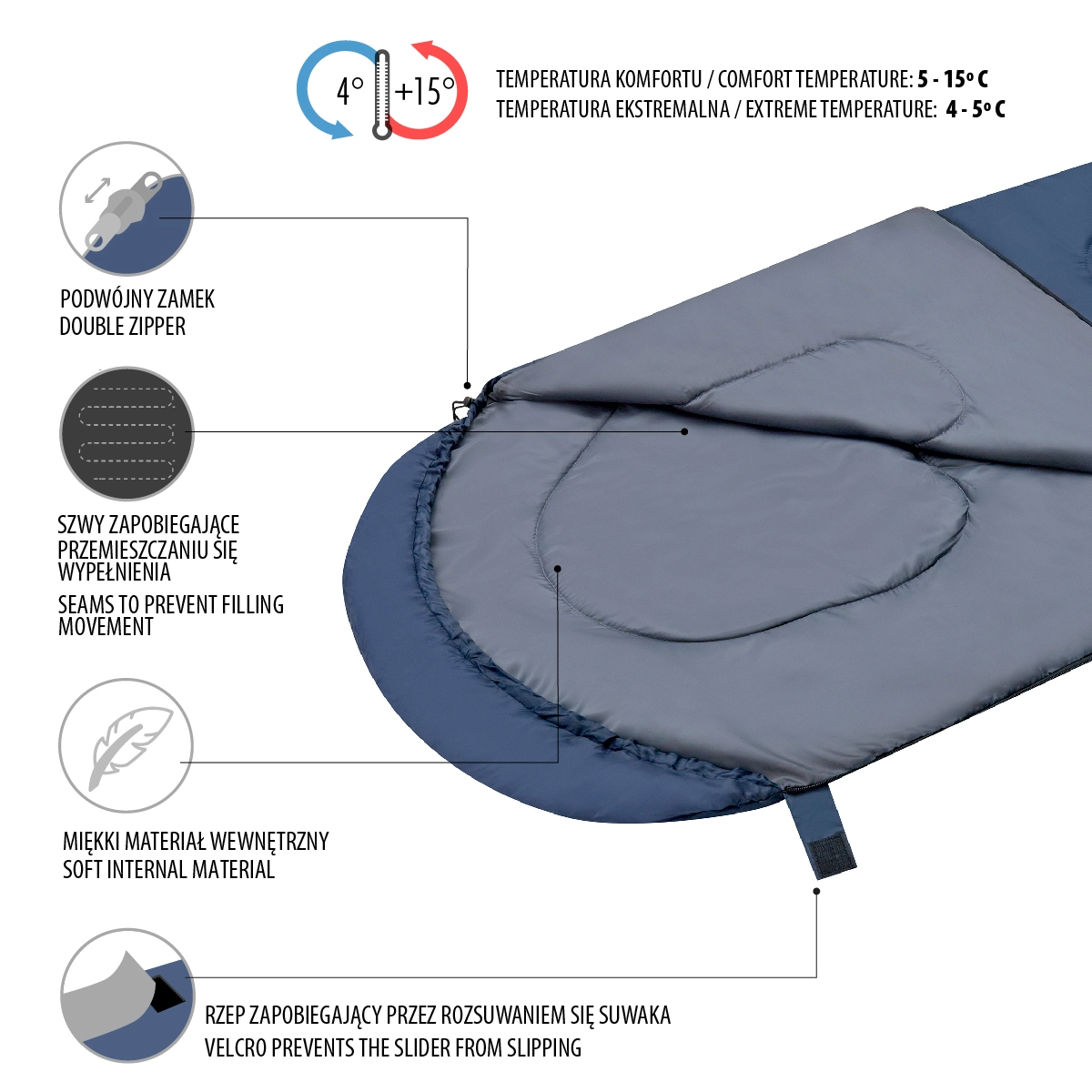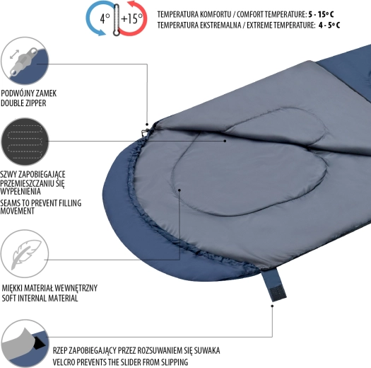 De lange tweerichtingsrits aan de zijkant en onderkant maakt volledig openen tot een deken mogelijk – ideaal voor warmere nachten. De rits wordt extra gezekerd met een brede manchet met klittenband, die onbedoeld openen tijdens beweging voorkomt. De capuchon met trekkoord en koordstopper minimaliseert warmteverlies en verhoogt het comfort onder koelere omstandigheden. De slaapzak wordt geleverd in een praktische hoes voor eenvoudig transport.