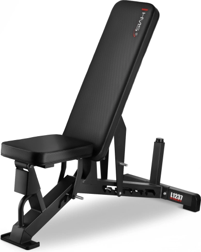 De HMS L1237 is een verstelbare fitnessbank, ontworpen voor effectieve krachttraining met dumbbells en halterstangen. Het brede verstelbereik van de rugleuning van 94° tot 180° en 3 niveaus van zitschuinte maken gerichte training van borst, rug en schouders mogelijk, zowel vlak, schuin als in een rechtopstaande positie. Dikke bekleding en een stabiele basis garanderen comfort en veiligheid, ook bij hogere belasting.