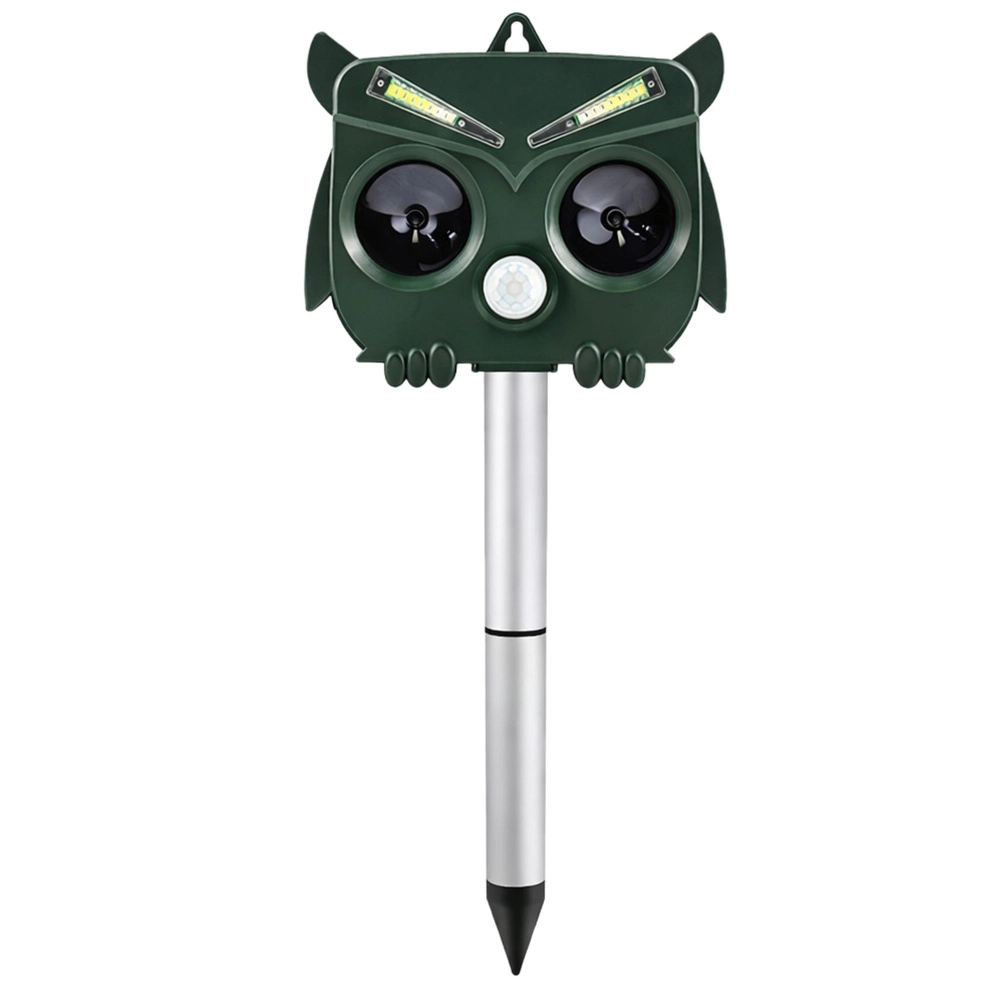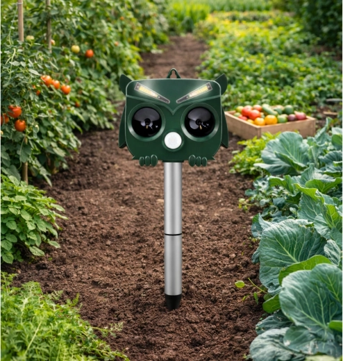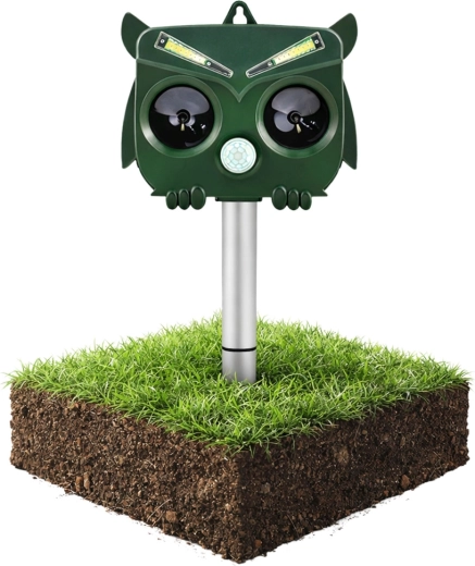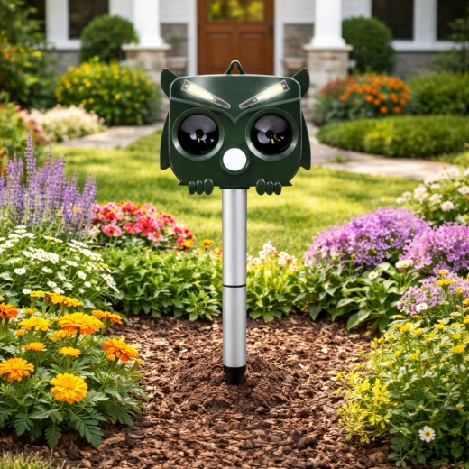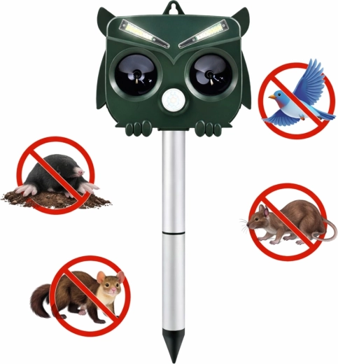 Het uilvormige design oogt natuurlijk en jaagt in combinatie met ultrasoon, geluid en LED-flitsen ongewenste dieren betrouwbaar weg zonder hun gezondheid te schaden. De PIR-sensor activeert het apparaat alleen bij beweging, wat energie bespaart en de gebruiksduur verlengt.