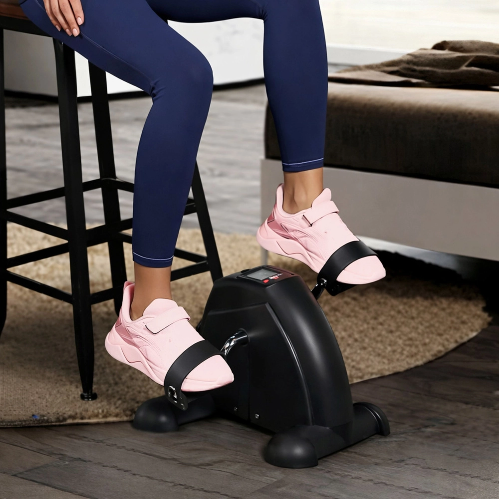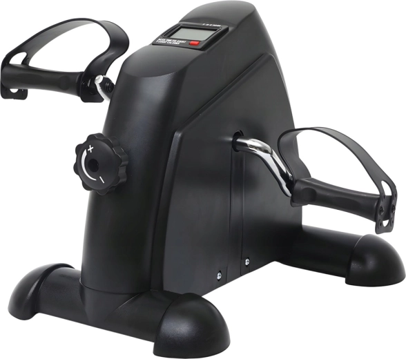 Het geïntegreerde LCD-display toont de belangrijkste statistieken – tijd (TIME), calorieën (CAL), aantal omwentelingen (CNT), omwentelingen per minuut (RPM) en de SCAN-functie. Een stevige, brede basis, antislipvoetjes en verstelbare pedalenriempjes zorgen voor zekerheid bij trappen op de vloer en bij draaien met de handen op tafel.