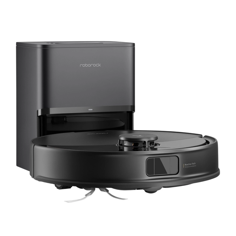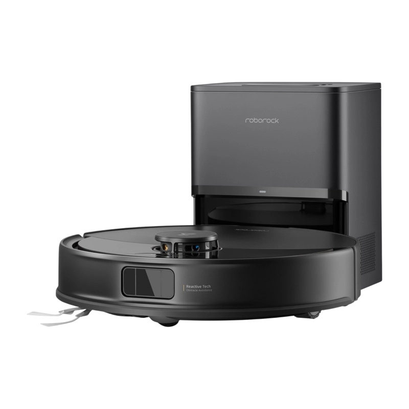 Het RockDock Plus-station leegt de stofbak van de robot automatisch in een zak met effectieve allergenenfiltratie – vervangen is gemiddeld eens per 7 weken nodig. De hoofd-V-borstel met rubbersegmenten en de JawScrapers-kam, plus de asymmetrische zijborstel, minimaliseren het vastdraaien van haren.