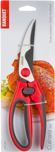 Praktische Culinaria-gevogelteschaar van 24 cm met gebogen snijblad voor makkelijk portioneren en precisieknippen. Duurzaam staal en een ergonomisch kunststof handvat in het rood zorgen voor een stevige grip en veilig gebruik bij het bereiden van kip, eend of kalkoen.