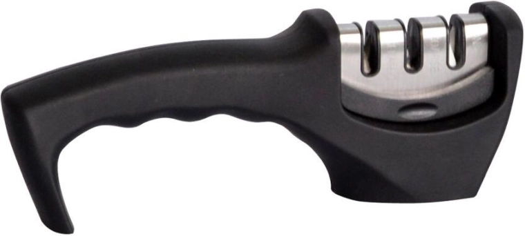 Praktische messenslijper met ergonomische handgreep voor dagelijks gebruik. Biedt drie slijpfasen – grof, fijn en voor keramische messen. Dankzij de stabiele constructie en de comfortabele grip herstelt u de scherpte van keukenmessen eenvoudig en snel.