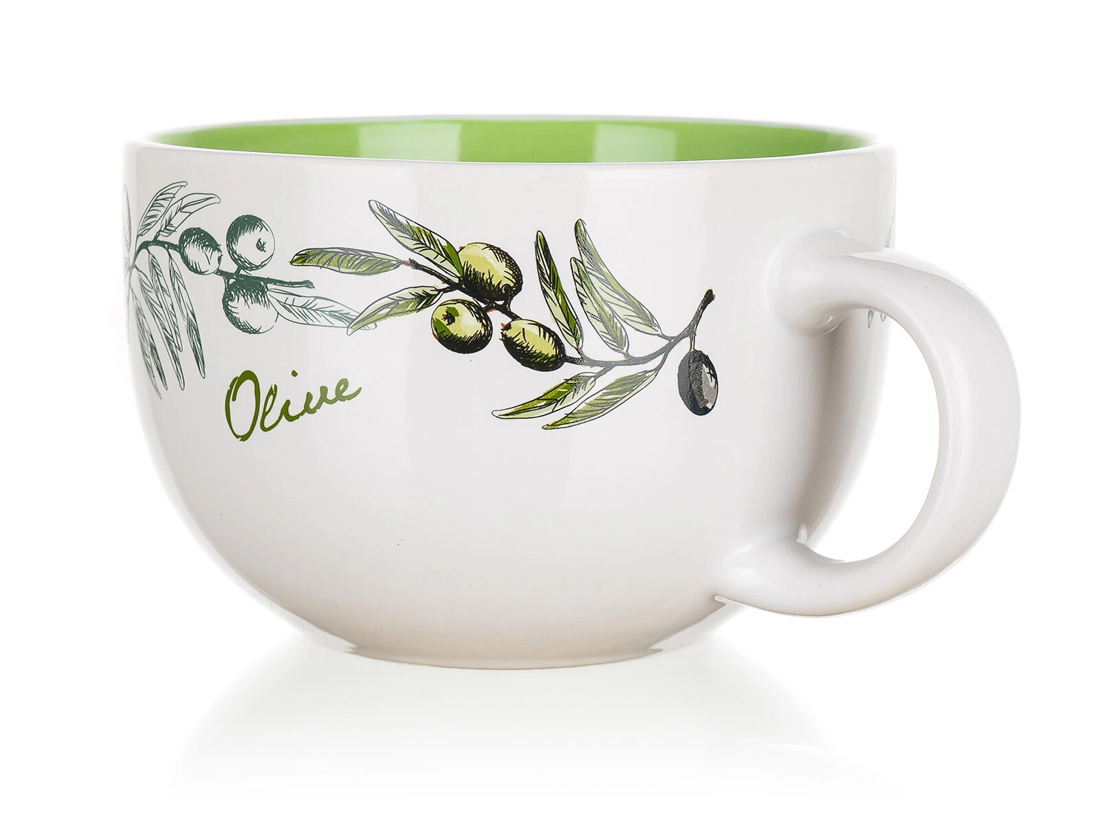 Grote keramische mok met olijventhema en een inhoud van 660 ml, ideaal voor dagelijks gebruik. Geniet stijlvol van je favoriete warme en koude dranken – praktische inhoud, duurzame keramiek en olijvendecor voor een aangename sfeer aan tafel.
