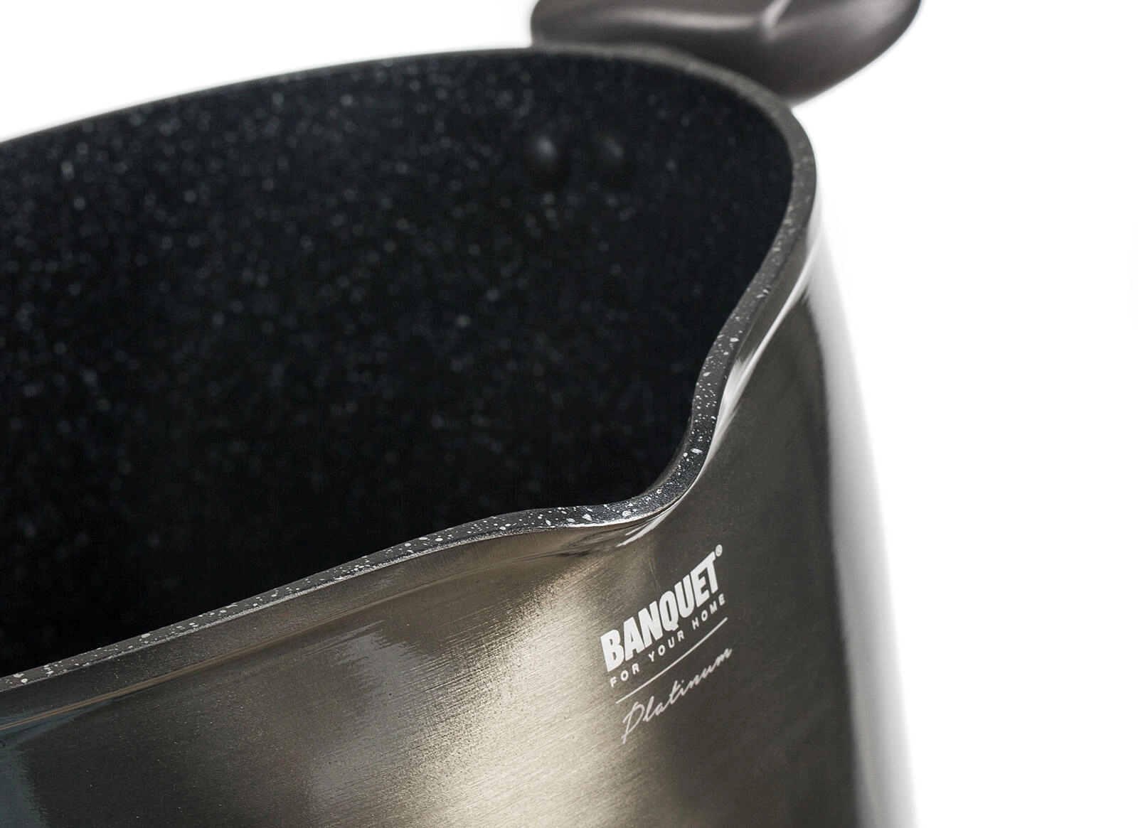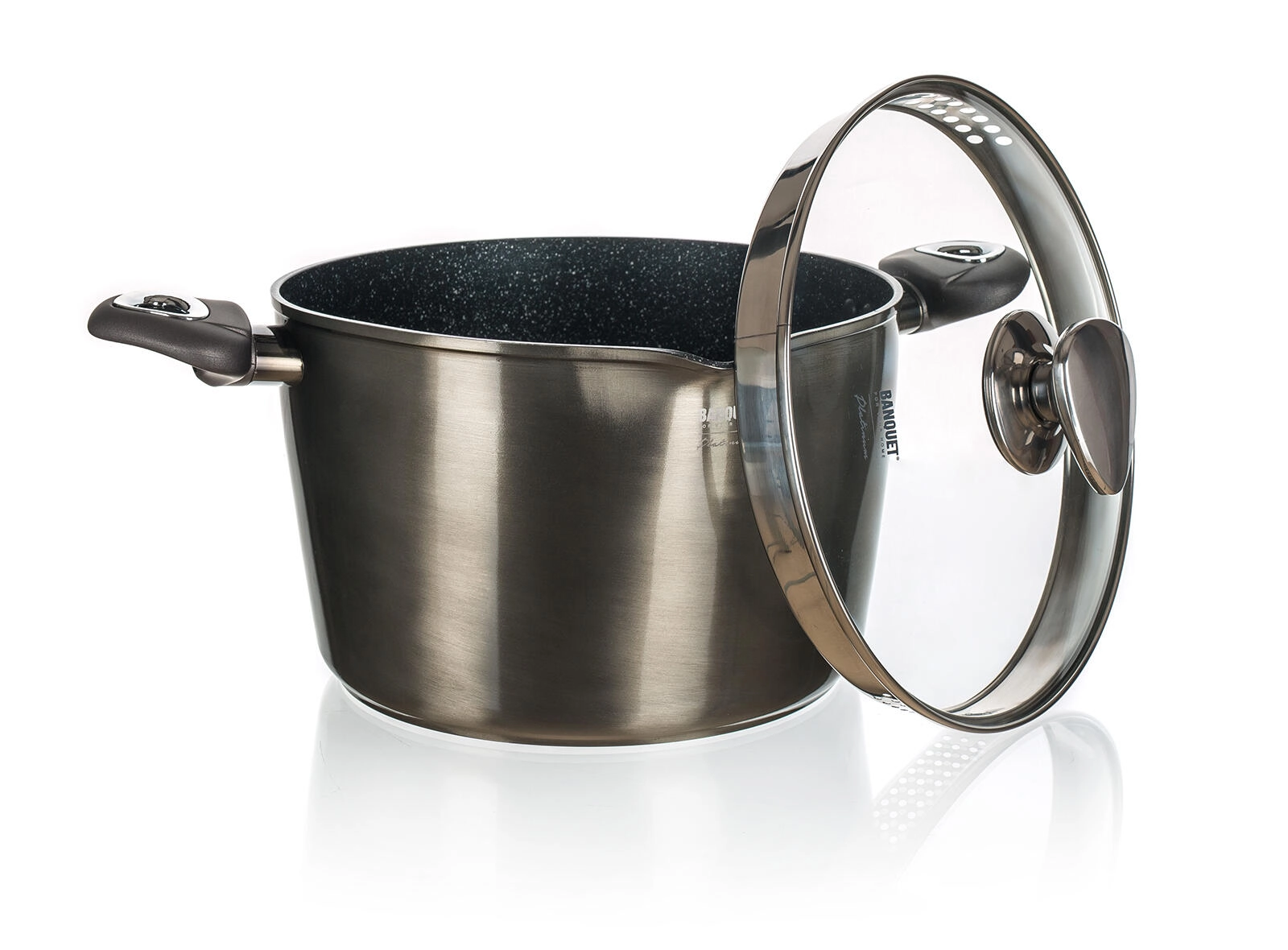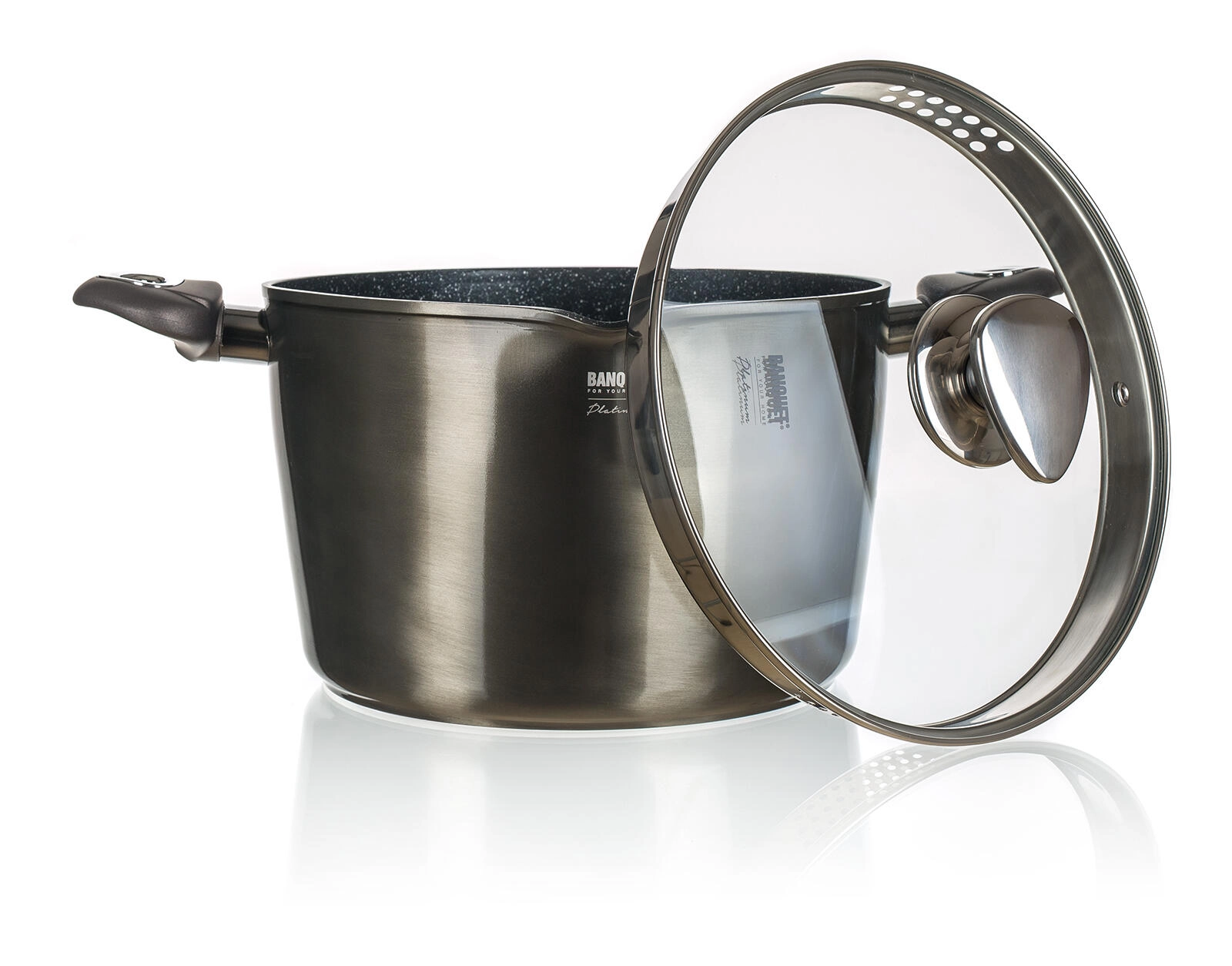 Kook soepen, sauzen en pasta zonder aanbranden. De METALLIC PLATINUM pan onderscheidt zich door een gegoten aluminium body met een stevige wanddikte van 3 mm voor gelijkmatige warmteverdeling en energiezuinig koken. De antiaanbaklaag is uitzonderlijk hard en bestand tegen krassen en stoten, waardoor hij perfect is voor dagelijks gebruik.