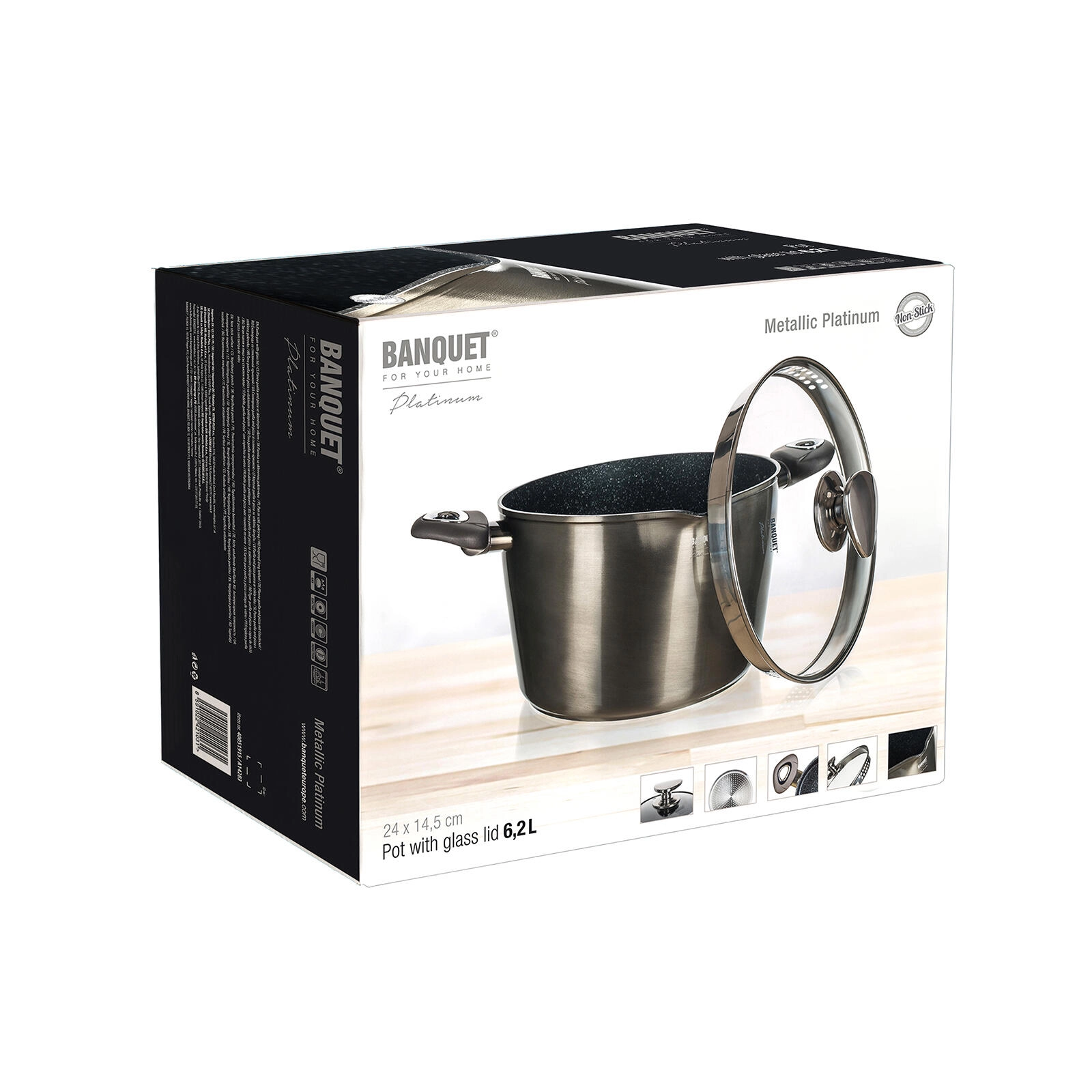 Robuuste gegoten aluminium pan METALLIC PLATINUM met een inhoud van 6,2 l en een diameter van 24 cm biedt een antiaanbaklaag met hoge slijtvastheid, een volledig inductiebodem voor snel opwarmen en een praktische schenktuit voor eenvoudig afgieten. Het glazen deksel met ventiel maakt kookcontrole mogelijk, terwijl de soft-touch handgrepen en de roestvrijstalen knop zorgen voor comfortabele en veilige hantering.