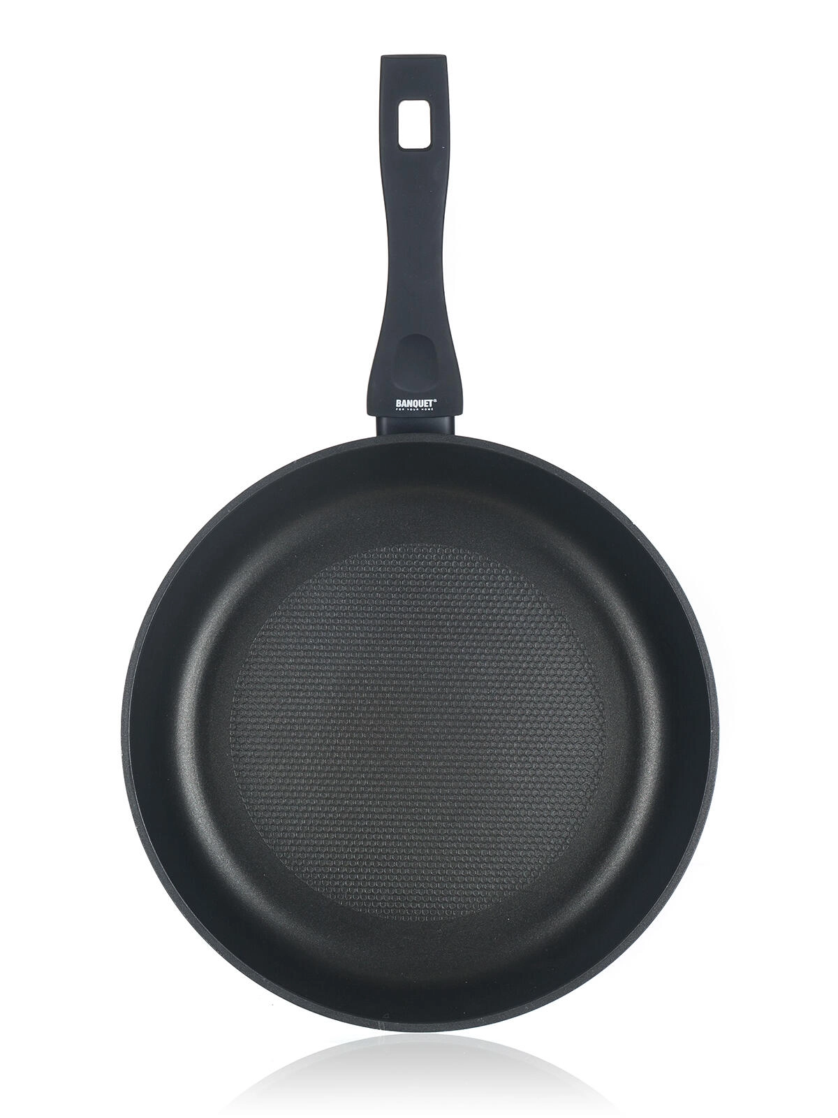 Ontdek de veelzijdige GRAZIA-pan met een diameter van 28 cm en een premium 3-laagse antiaanbaklaag ILAG PREMIUM voor moeiteloos koken zonder aanbakken. Dankzij het gesmede aluminium geleidt hij warmte uitstekend, met een inductiebodem is hij geschikt voor alle soorten kookplaten en de hittebestendige buitencoating weerstaat dagelijks gebruik. Het matzwarte design wordt aangevuld met een ergonomische handgreep voor comfortabel en veilig vasthouden.