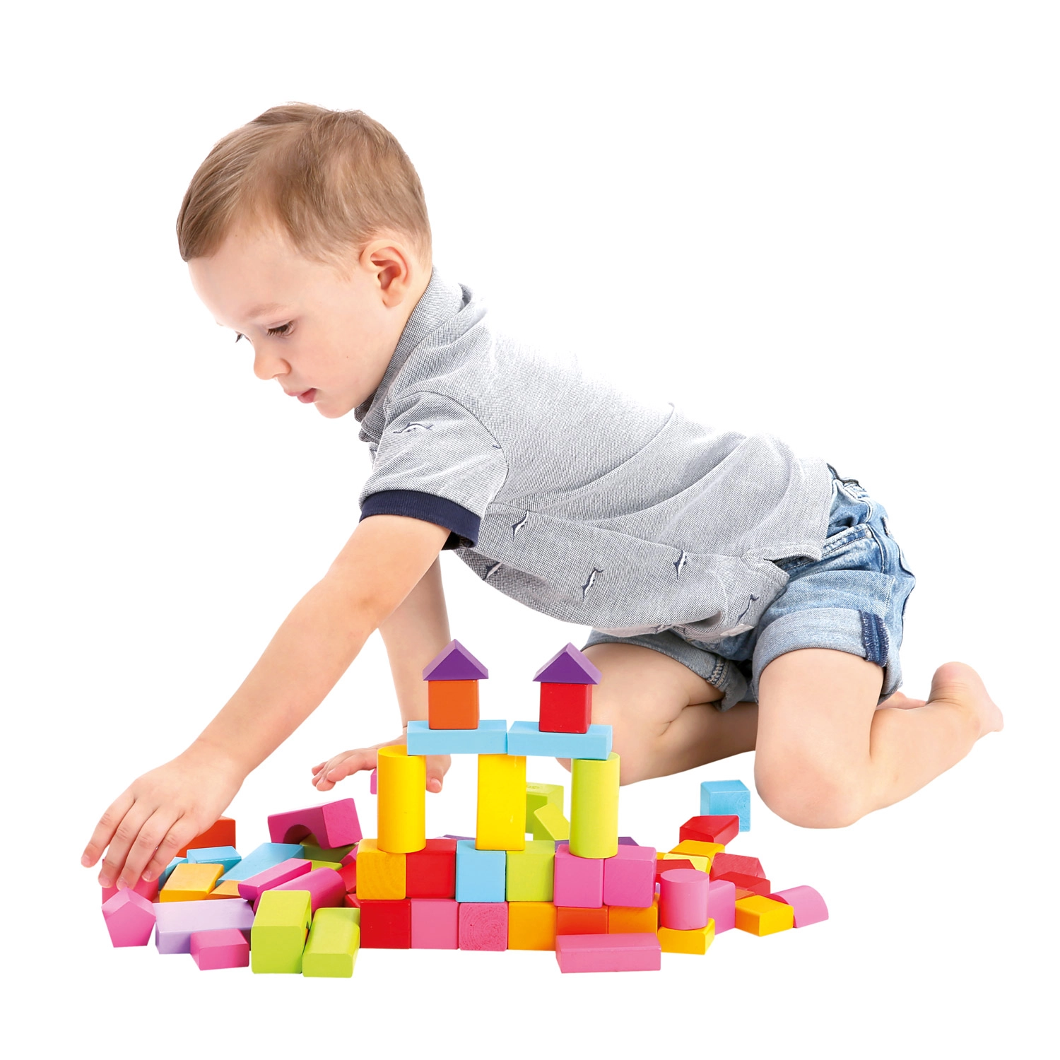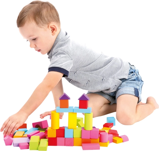 Ideaal voor kinderen vanaf 1 jaar: de blokken hebben een prettig glad oppervlak, levendige, veilige kleuren en een gevarieerde reeks vormen – van kubussen en rechthoeken tot cilinders, bogen en driehoeken. Spelen met blokken ondersteunt de ontwikkeling van ruimtelijk inzicht, creativiteit en oog-handcoördinatie.