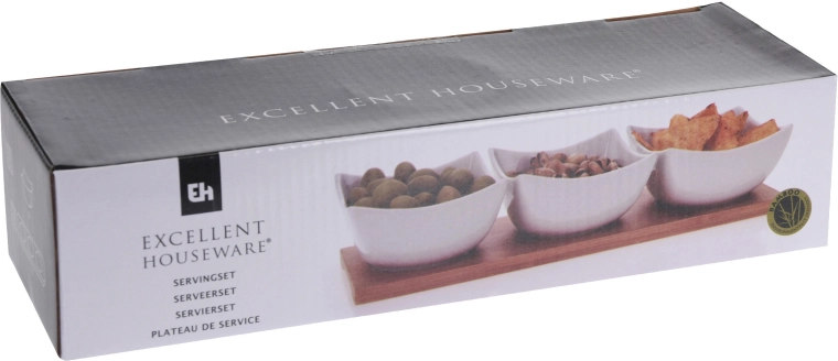 Stijlvolle serveerset voor dagelijks tafelen en feestelijke momenten. Bevat drie porseleinen schaaltjes in zuiver wit en een bamboe dienblad voor elegant serveren van dipjes, sauzen en kleine lekkernijen. Eenvoudig te combineren met elk servies en geeft de tafel een moderne uitstraling.