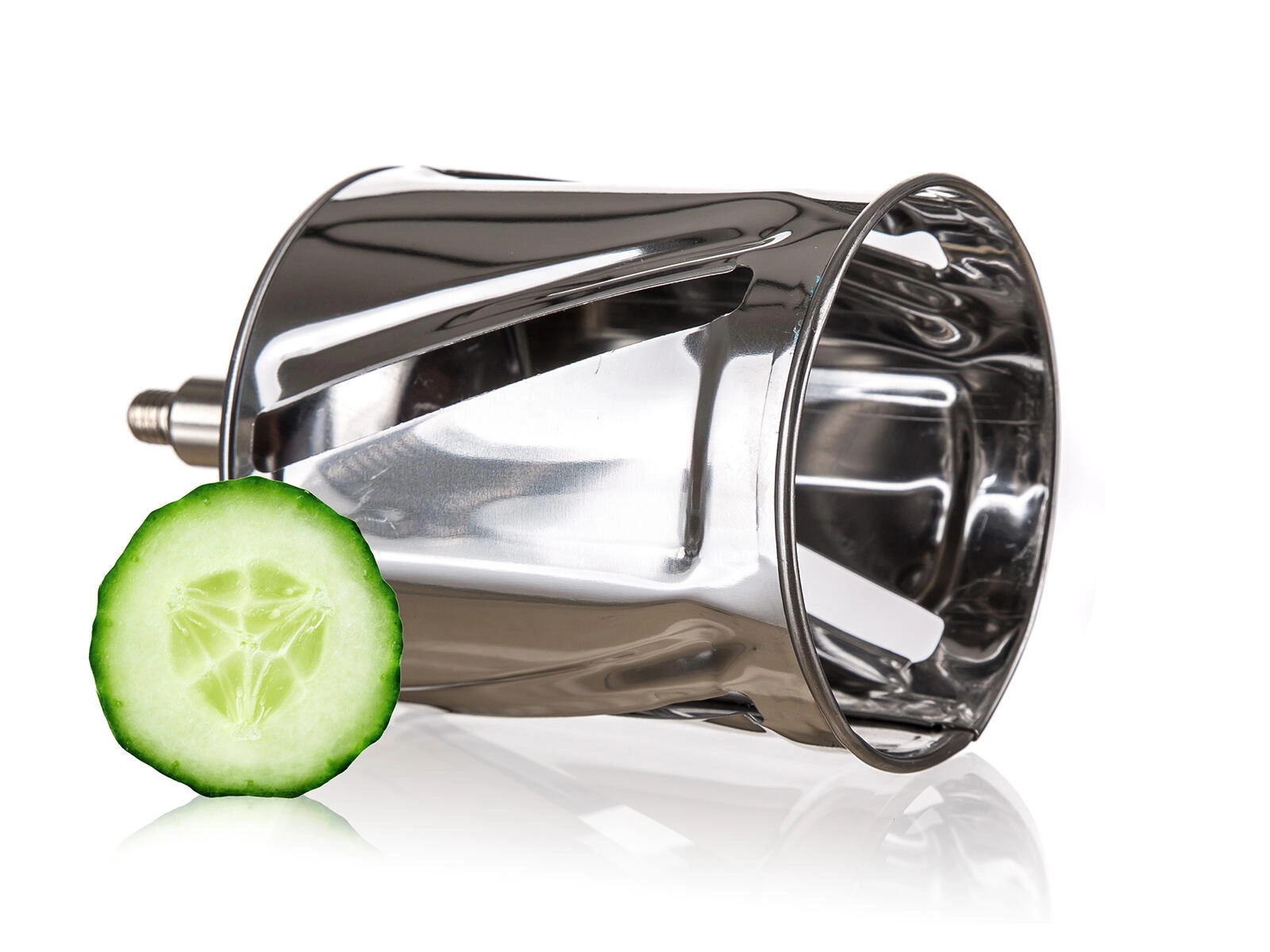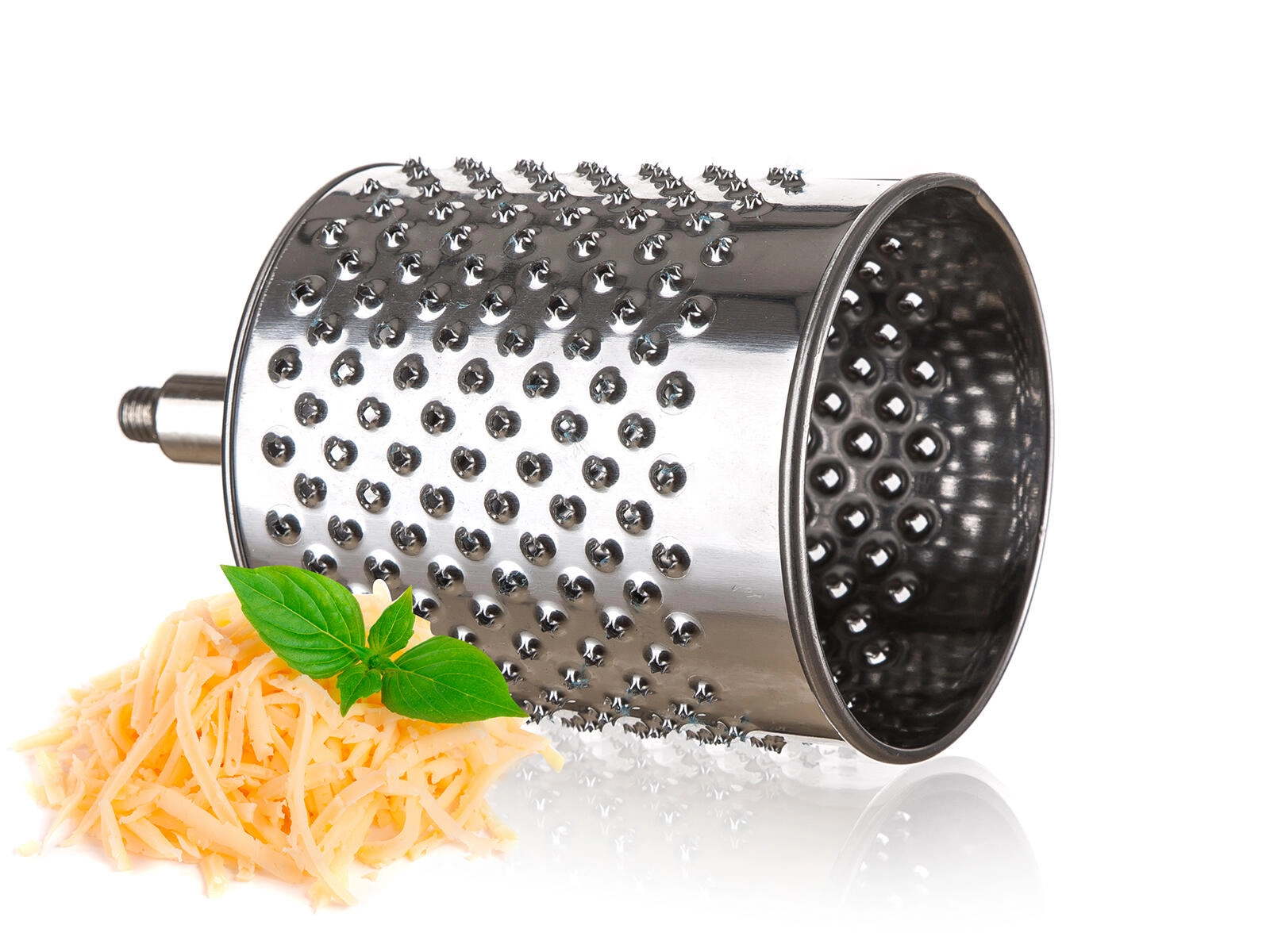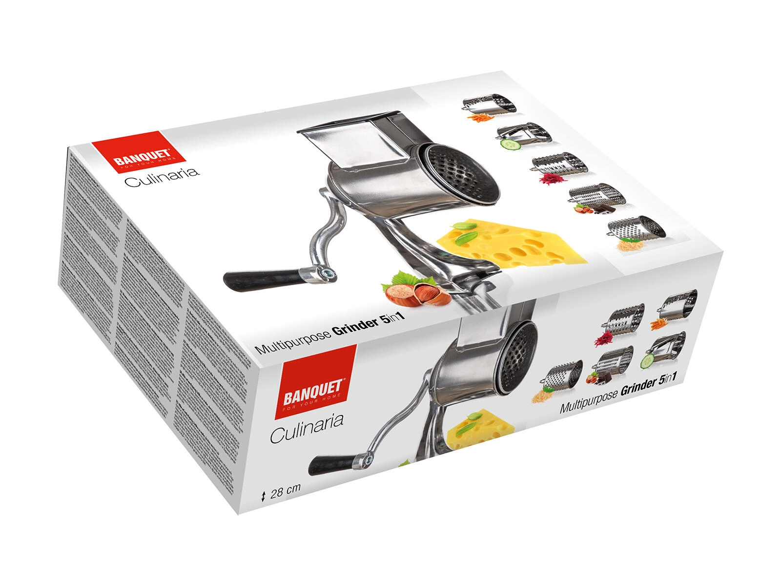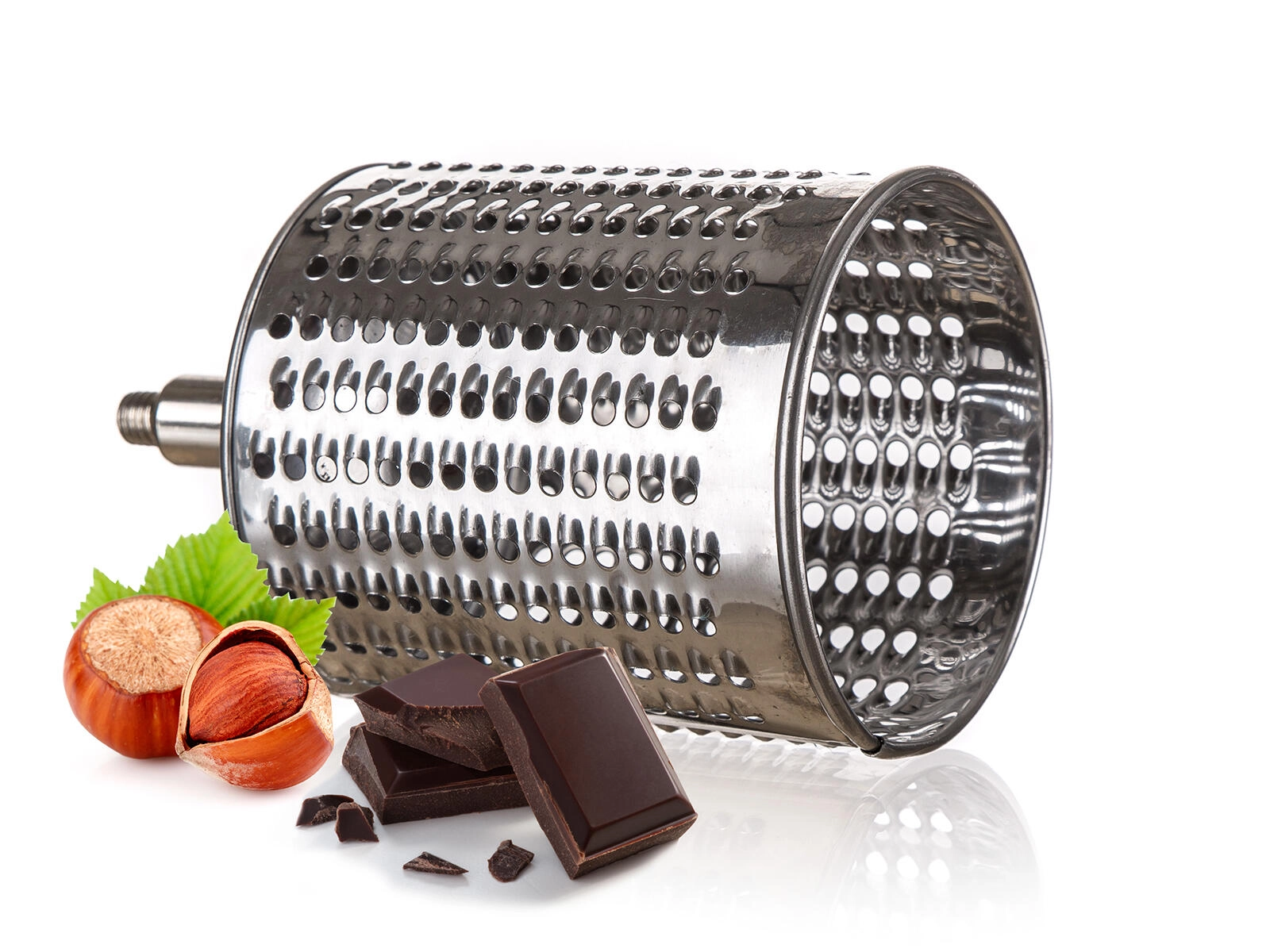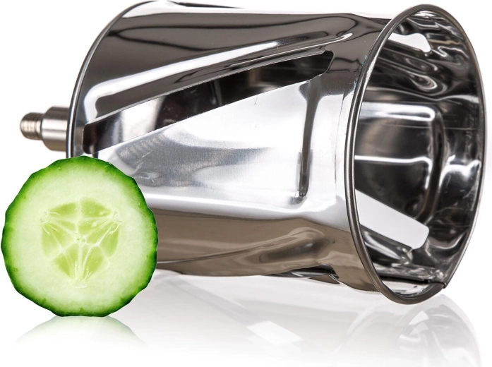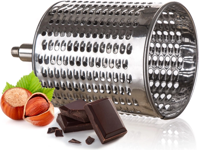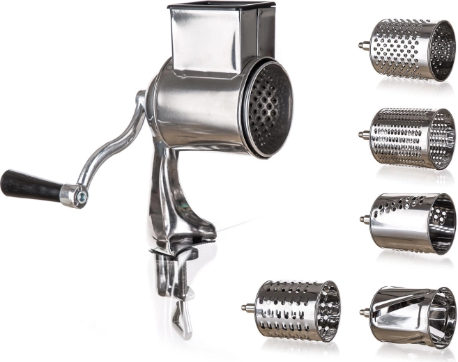 Praktische handrasp en snijder 5-in-1 van roestvrij staal voor eenvoudig raspen, snijden en schaven van noten, chocolade, groenten, fruit en harde kazen. Wordt geleverd met 5 verwisselbare trommelopzetstukken, een stabiele bevestiging aan het werkblad en een veilig aanduwstokje. Roestvrijstalen onderdelen zijn gemakkelijk te reinigen en vaatwasmachinebestendig.