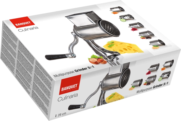 Geniet van snelle en gelijkmatige voorbereiding van ingrediënten met de multifunctionele roestvrijstalen rasp 5-in-1. De robuuste metalen behuizing met klem blijft stevig op het werkblad staan, de handzwengel loopt soepel en de vijf trommelopzetstukken dekken fijn en grof raspen, plakjessnijden en julienne.