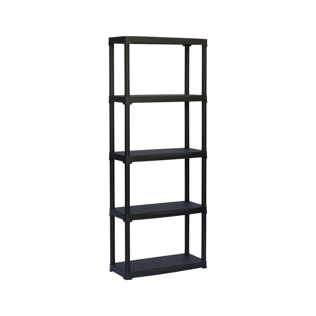 Universele kunststof stelling met vijf legborden voor overzichtelijke opslag van gereedschap, voorraden en huishoudelijke benodigdheden. Biedt eenvoudige montage zonder gereedschap, makkelijk onderhoud en duurzaam polypropyleen materiaal geschikt voor garage, kelder, werkplaats en woning. Elk legbord draagt tot 20 kg.