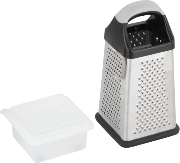Ontdek een veelzijdige keukenhulp: een vierzijdige rasp van hoogwaardig roestvrij staal met een ergonomische kunststof handgreep. Met het meegeleverde bakje vang je makkelijk geraspte groenten, kaas of chocolade op en houd je het werkblad schoon.