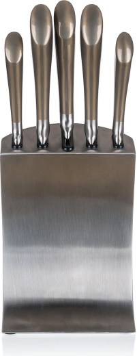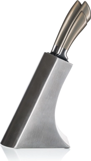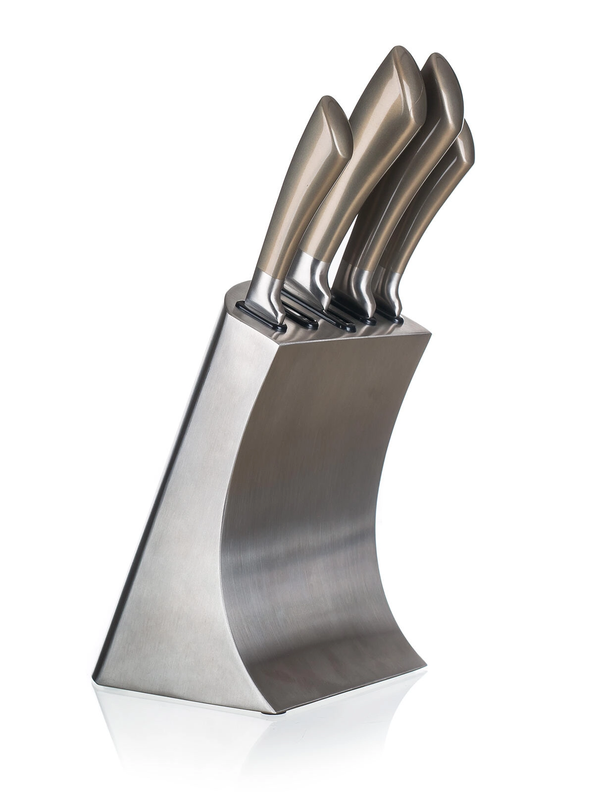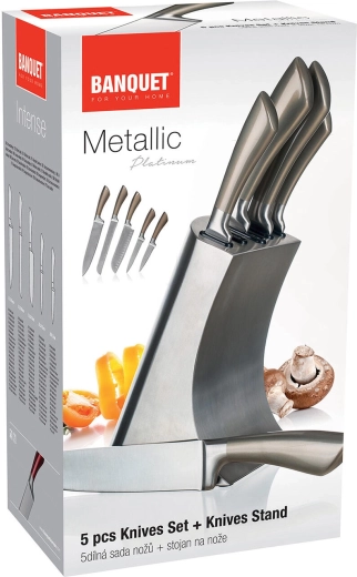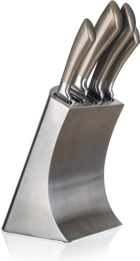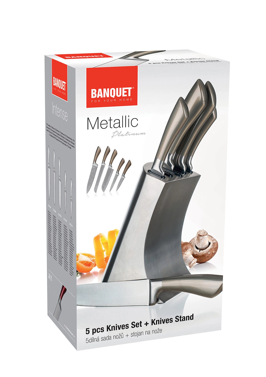 De METALLIC Platinum set combineert een moderne uitstraling met functionaliteit. De roestvrijstalen messen bieden betrouwbare scherpte en eenvoudig onderhoud, terwijl de stabiele metalen standaard de bladen veilig en binnen handbereik houdt. Perfect voor iedere keuken waar prestaties en design tellen.
