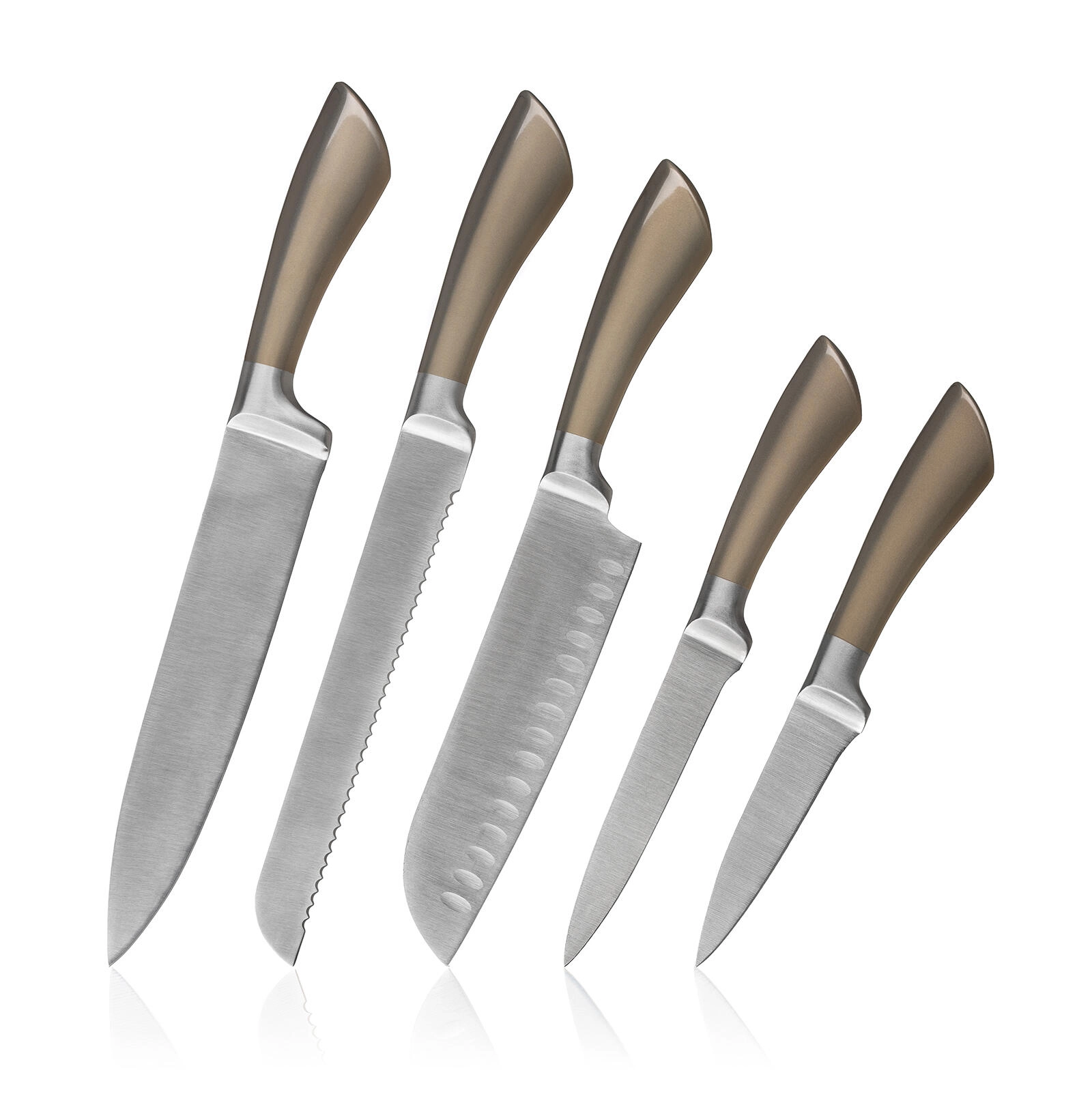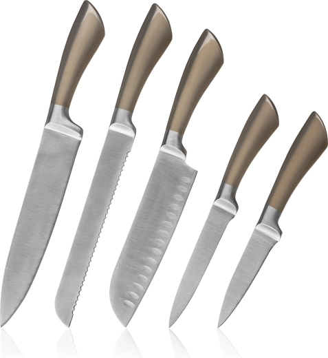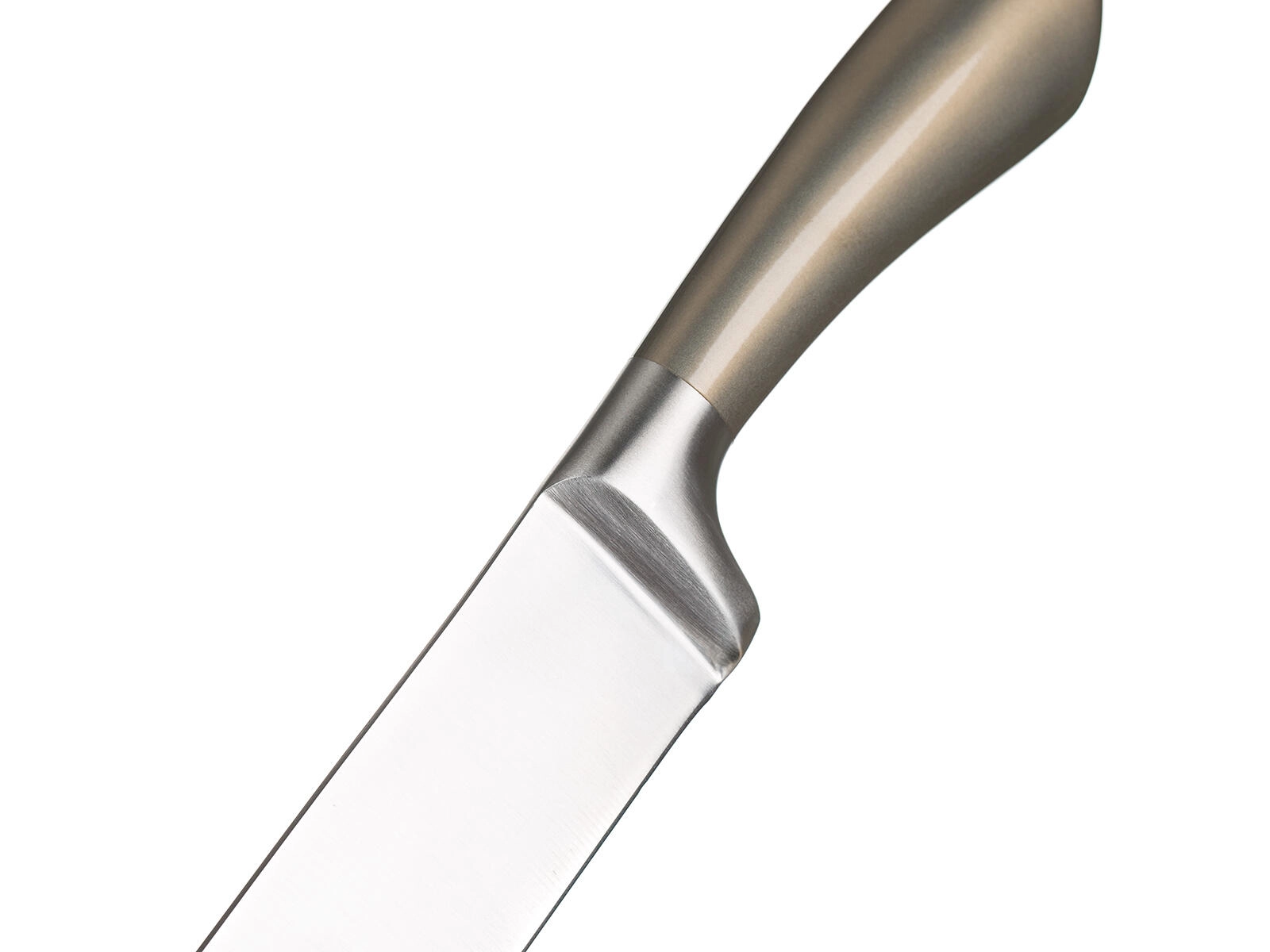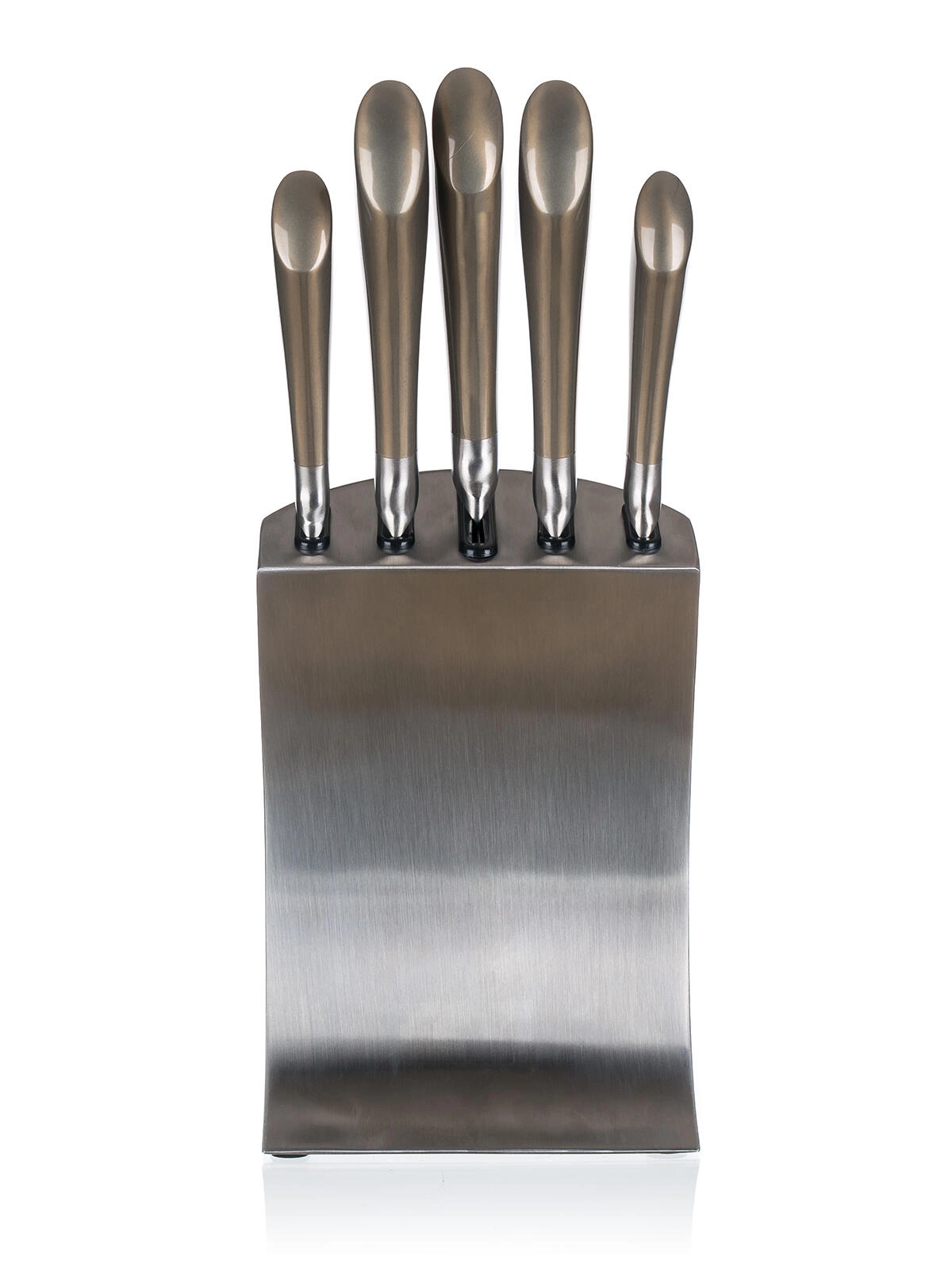 De METALLIC Platinum set combineert een moderne uitstraling met functionaliteit. De roestvrijstalen messen bieden betrouwbare scherpte en eenvoudig onderhoud, terwijl de stabiele metalen standaard de bladen veilig en binnen handbereik houdt. Perfect voor iedere keuken waar prestaties en design tellen.