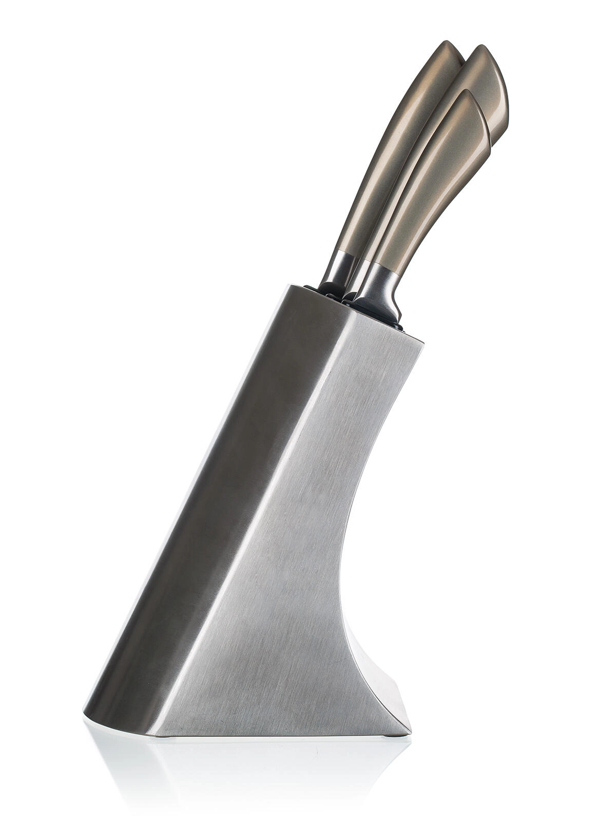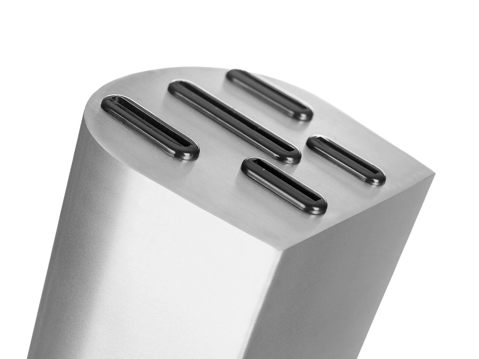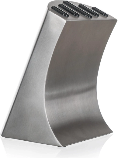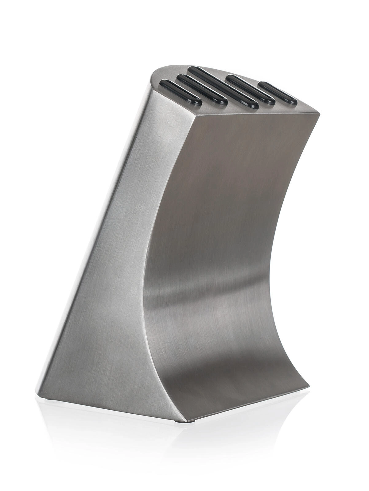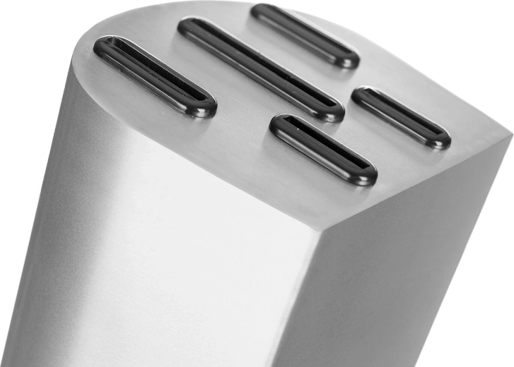 De elegante metalen blokhouder met antislipbodem ordent alle messen, beschermt de snedes en zorgt voor snelle toegang tijdens het koken.