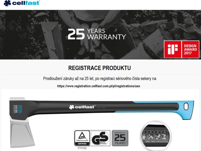 Op CELLFAST-producten geldt een wettelijke garantie van 2 jaar. Voor CELLFAST-bijlen kan de garantie na registratie worden verlengd tot 25 jaar (registratie wordt uitgevoerd door de eindklant met behulp van de unieke 16-cijferige code die op de bijl staat vermeld).