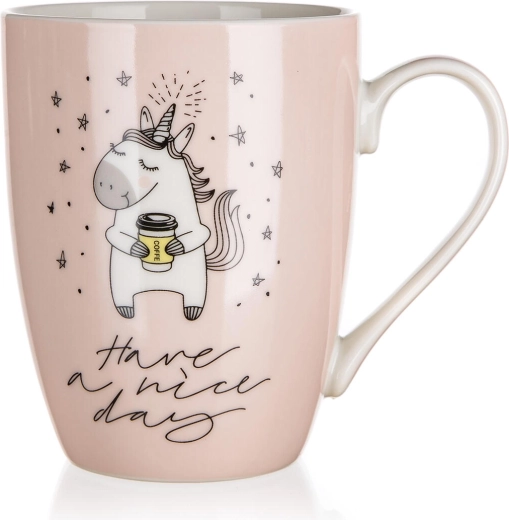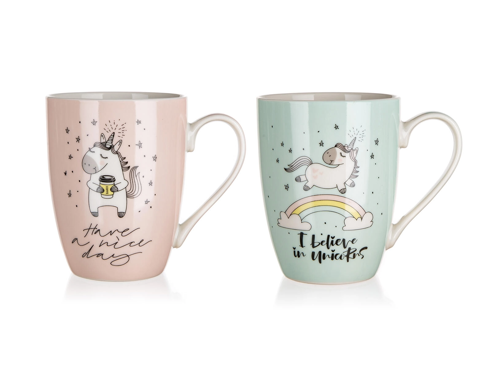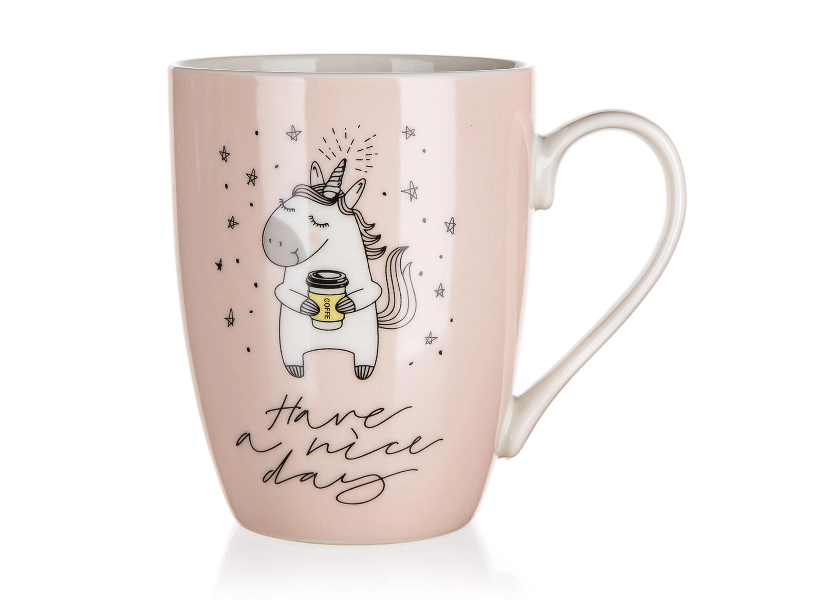 De mok is verkrijgbaar in twee designs – met de teksten “I believe in unicorns” en “Have a nice day”. Bovenste diameter ca. 8 cm, onderste diameter ca. 5,5 cm. Dankzij het eenvoudige onderhoud in de vaatwasser en de mogelijkheid om op te warmen in de magnetron is het een praktische aanvulling voor elke keuken.