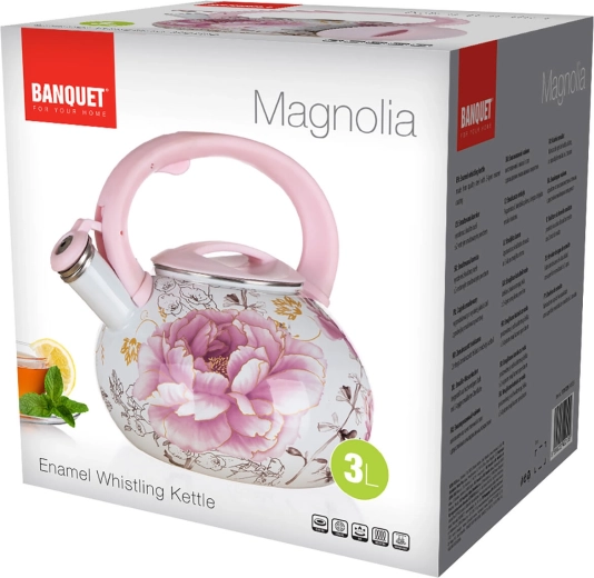 Elegante geëmailleerde theeketel met romantisch MAGNOLIA-decor en een inhoud van 3 l die elke ochtend aangenamer maakt. Geschikt voor alle soorten warmtebronnen, inclusief inductie, en dankzij de geïntegreerde fluit meldt hij betrouwbaar het kookpunt. Een stijlvol accessoire dat een praktisch én decoratief element in de keuken wordt.