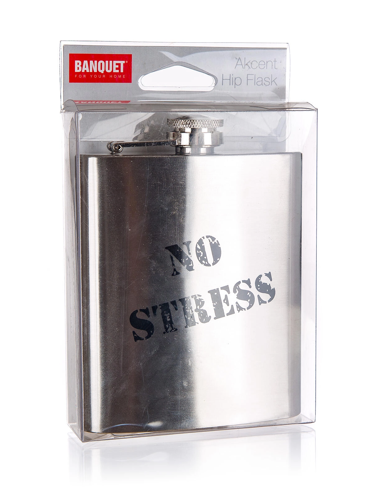 Geniet stijlvol en zorgeloos van je favoriete sterke dranken of sappen. De Akcent No Stress heupfles van hoogwaardig roestvrij staal is licht, robuust en ontworpen voor comfortabel meenemen. Het moderne motief No Stress is leuk als cadeau en als persoonlijk accessoire voor tochten, festivals of de natuur.