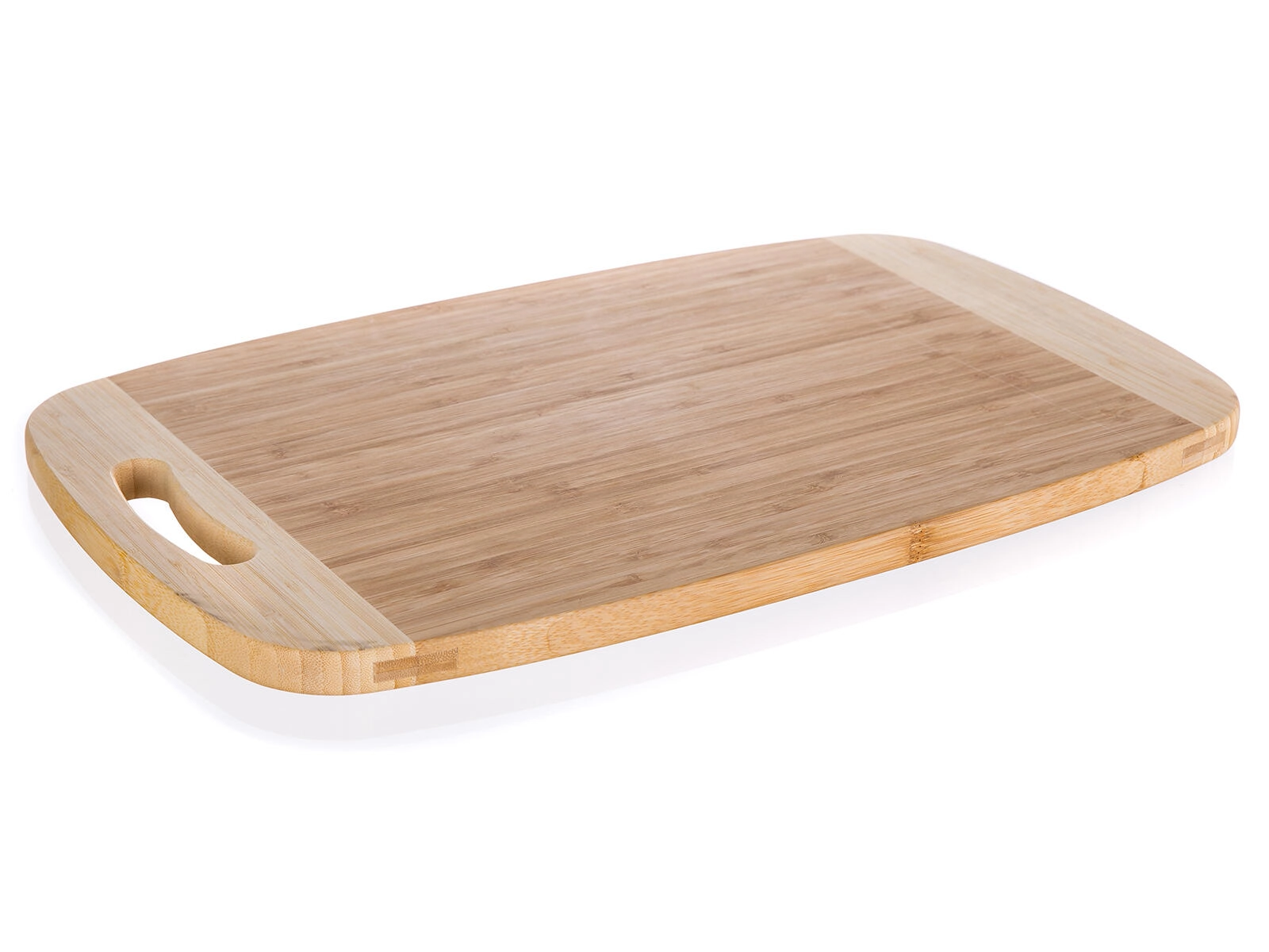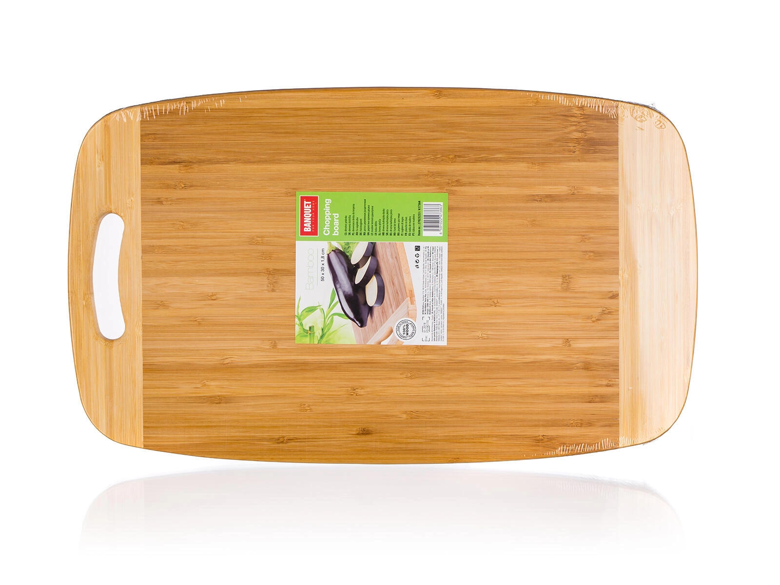 Praktische en duurzame bamboe snijplank BRILLANTE met afmetingen 50 × 30 × 1,8 cm voor comfortabel snijden van vlees, groenten en brood. Dankzij het ruime werkoppervlak vergemakkelijkt het het portioneren van grotere stukken voedsel, heeft het een geïntegreerd handvat/gat om op te hangen en een stevig bamboe oppervlak dat mesvriendelijk is in een elegante tweekleurige uitvoering.