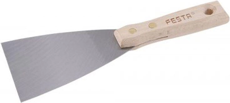 De praktische stalen spatel FESTA met een breedte van 90 mm is een betrouwbare hulp voor zowel doe-het-zelvers als professionals. Het stevige stalen blad verwijdert eenvoudig oude verflagen, vuil en oneffenheden, terwijl het comfortabele houten handvat zorgt voor een zekere grip en nauwkeurige geleiding van het gereedschap.