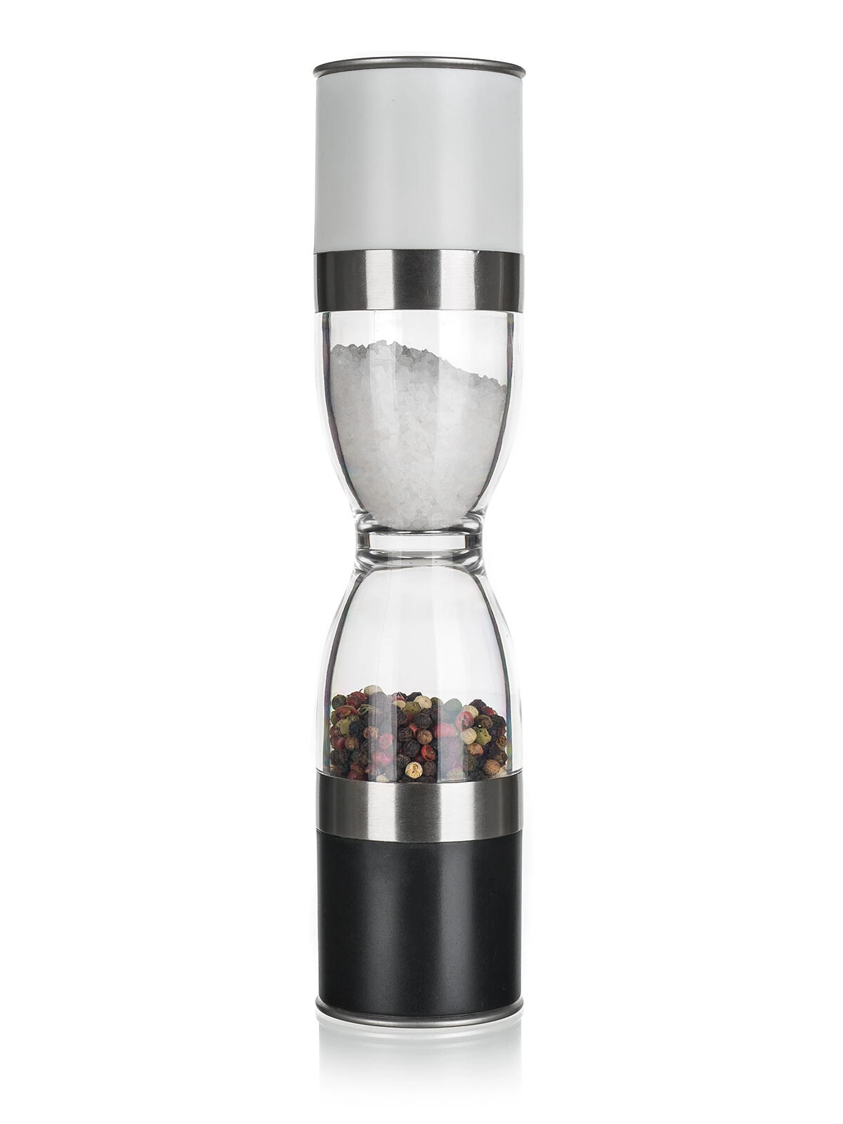 Bespaar ruimte en tijd: één zijde voor zout, de andere voor peper. Transparante kamers maken in één oogopslag zichtbaar hoeveel en welk kruid erin zit.