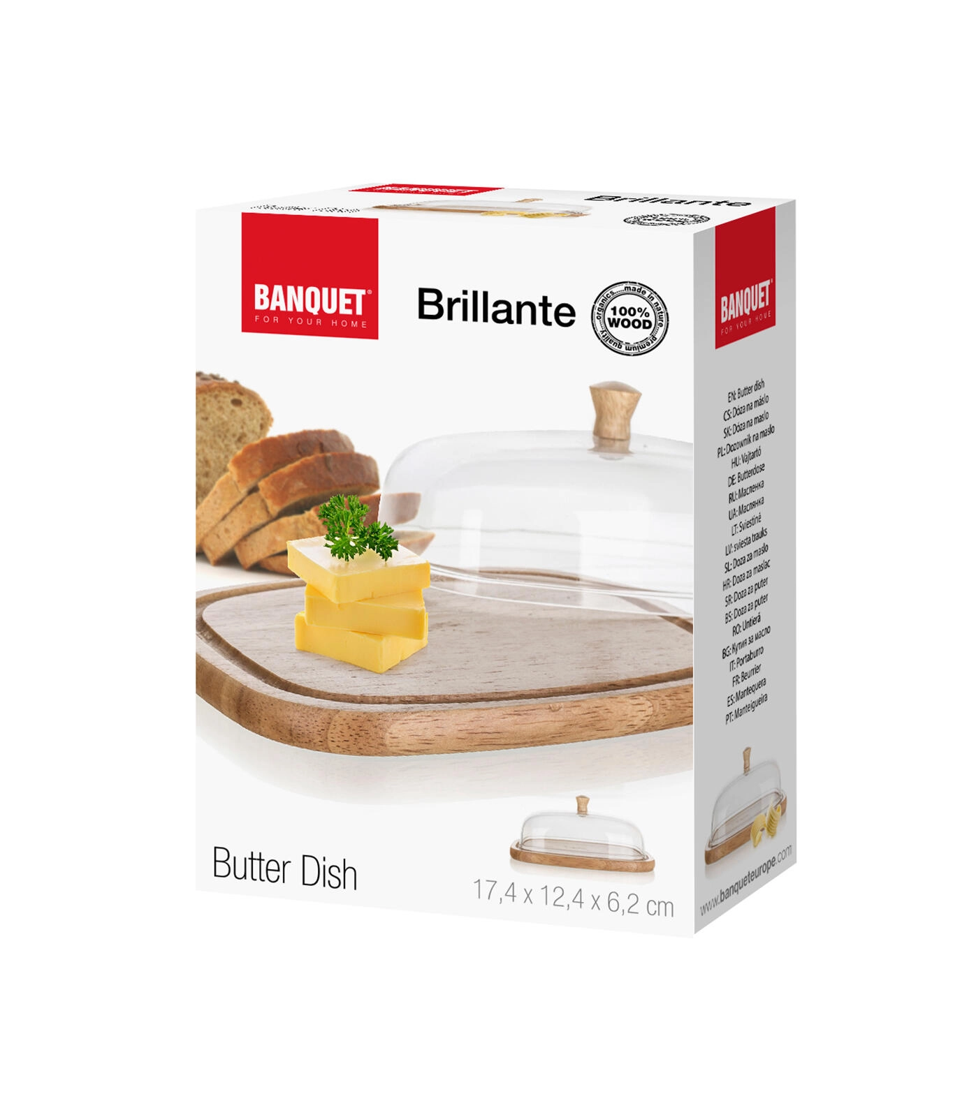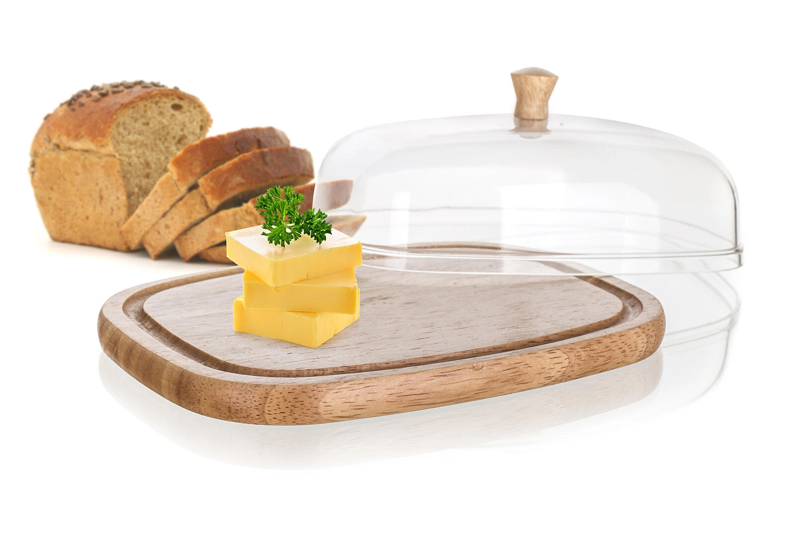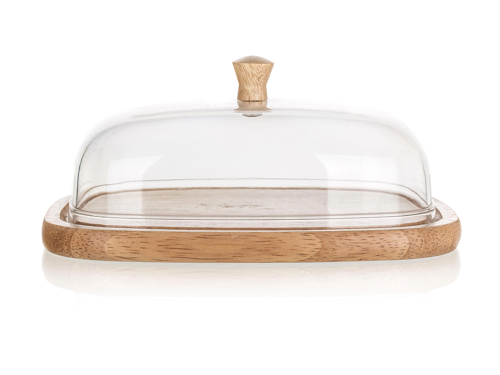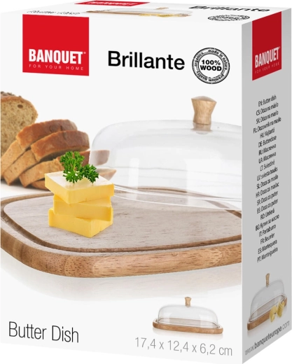 De stijlvolle BRILLANTE boter- en kaasdoos is een praktische aanvulling op iedere keuken en eettafel. De heldere acryl stolp met houten knop beschermt etenswaren tegen uitdrogen en ongewenste geuren, terwijl het natuurlijke rubberhouten dienblad een warme, moderne look aan het serveren geeft.