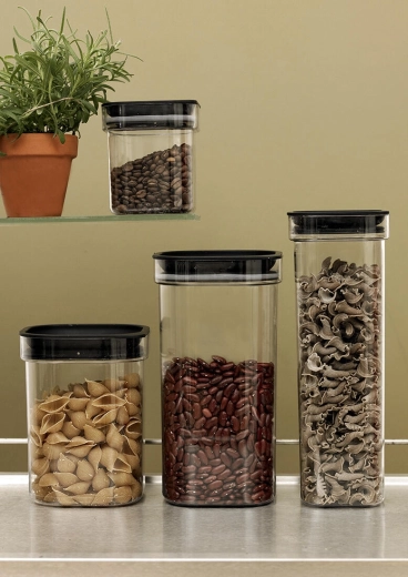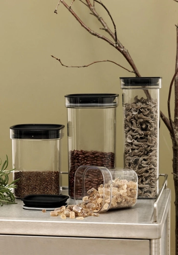 Dankzij het heldere kunststof heeft u altijd zicht op de inhoud en hoeveelheid, terwijl de compacte vierkante vorm en de mogelijkheid om te stapelen helpen om ruimte in kasten te besparen. Materialen van hoge kwaliteit – NAS, polypropyleen en siliconen – garanderen duurzaamheid en een lange levensduur bij dagelijks gebruik.
