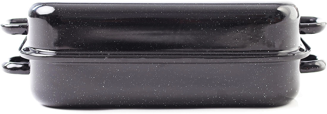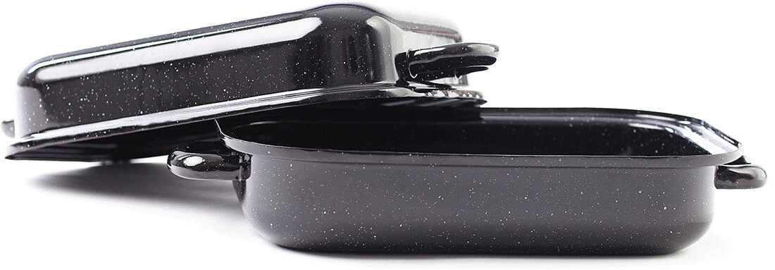 Klassieke geëmailleerde braadslede met deksel BERYL met een inhoud van 2,8 l, ideaal voor dagelijks braden van vlees, groenten en zoete lekkernijen. Het duurzame geëmailleerde oppervlak is eenvoudig te reinigen, het deksel helpt de sappigheid te behouden en de praktische afmetingen passen in de meeste ovens. Tijdloze Tsjechische klassieker in zwart graniet voor een lange levensduur.