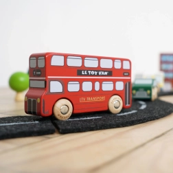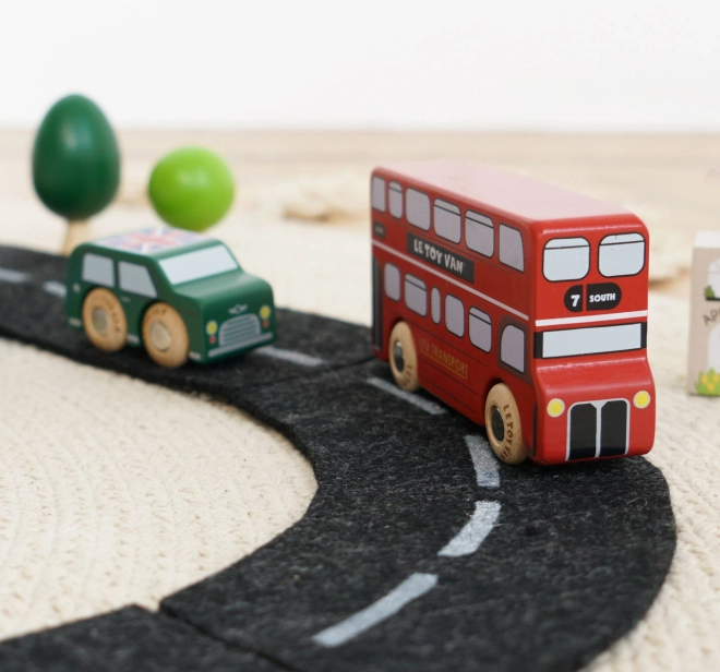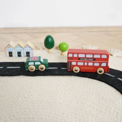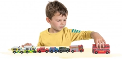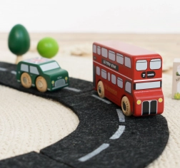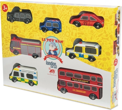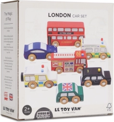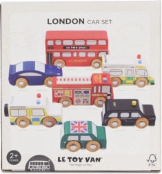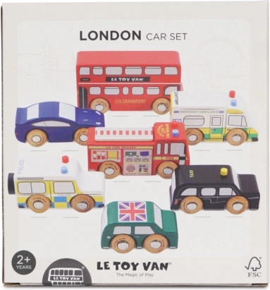Ontdek de wereld van de drukke Londense straten met gedetailleerde houten voertuigen van Le Toy Van. De set bevat een dubbeldekkerbus, een zwarte taxi, een brandweerauto, een ambulance, een politiewagen en twee personenauto’s. De robuuste uitvoering van duurzaam rubberhout en de afgeronde randen zijn ideaal voor kleine kinderhanden, die tijdens het spelen hun grijpkracht, hand-oogcoördinatie en verbeelding oefenen.