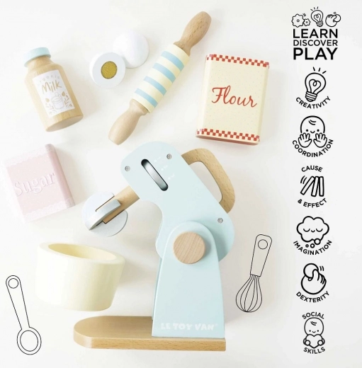 De stijlvolle Le Toy Van keukenrobot biedt kinderen een authentieke bakervaring in hun speelkeuken. Met de draaiende garde, houten deegroller en kom kunnen ze een “taart”, koekjes of cake “bakken”. Pasteltinten en retrodesign zijn een lust voor het oog, terwijl de hoogwaardige houten uitvoering zorgt voor lange levensduur.