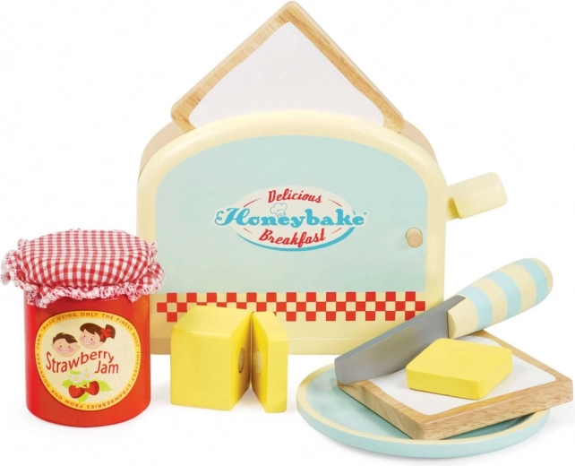 De houten Honeybake-set van LE TOY VAN tovert de kinderspeelhoek om tot een knusse keuken. Kinderen zullen dol zijn op de realistische broodrooster met veer, waaruit na het indrukken twee sneetjes “toast” omhoog springen. De boter met klittenbandsluiting leert de juiste greep en het werken met het mesje, terwijl het potje aardbeienjam en het bordje elke speelse ontbijtbereiding compleet maken.