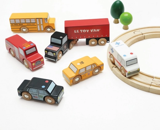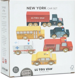 Ontdek de speelse set van zes houten voertuigen van LE TOY VAN, geïnspireerd op New York, gemaakt van duurzaam FSC-hout en beschilderd met niet-giftige verf op waterbasis. De set stimuleert fantasierijk spel, ontwikkelt de fijne motoriek en is compatibel met houten parkeergarages en treinbanen van LE TOY VAN en andere merken.