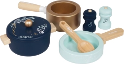 De pot met deksel, steelpan, koekenpan en houten accessoires stimuleren fantasierijk spel en het nabootsen van echt koken.