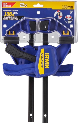 De set van twee professionele IRWIN Quick-Grip 150 mm klemmen is ontworpen voor snel, veilig en betrouwbaar klemmen bij montage, verlijmen en kleine reparaties. Dankzij de éénhandsbediening QUICK-RELEASE stel je ze comfortabel en moeiteloos af en klem je ze vast.