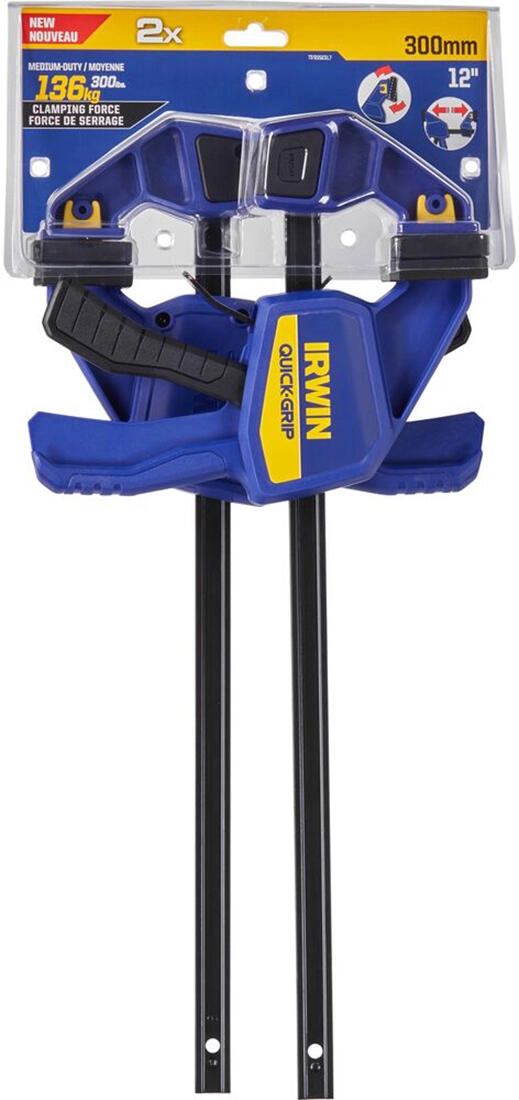 De set van twee stevige IRWIN QUICK-GRIP klemmen voor middelzware belasting is ontworpen voor snel, precies en veilig werken in de werkplaats en op de bouw. Het krachtige mechanisme levert tot 136 kg constante klemdruk, terwijl de QUICK-RELEASE eenhandsbediening comfortabel gebruik zonder extra hulp mogelijk maakt.