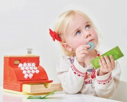 Kinderen kunnen echte aankopen nabootsen: op knoppen drukken, bonnen uitgeven, bankbiljetten en munten tellen en de kassalade openen. Het speelgoed is ontworpen voor langdurig gebruik – van duurzaam, ethisch verkregen hout met een afwerking op waterbasis.