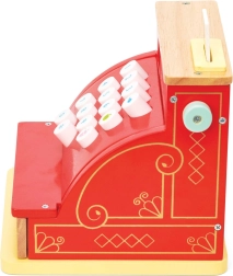 De vrolijke rode kleur met gouden accenten en de grote knoppen maken van deze kassa een aantrekkelijke blikvanger voor elke kinderwinkel.