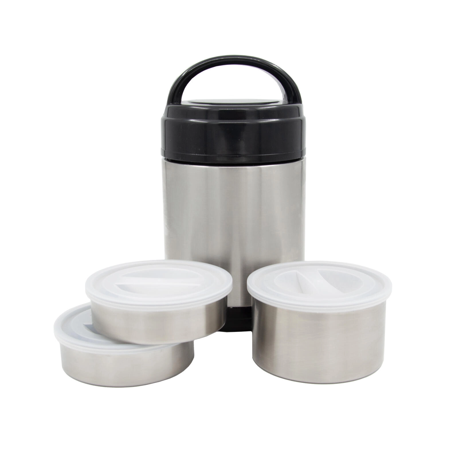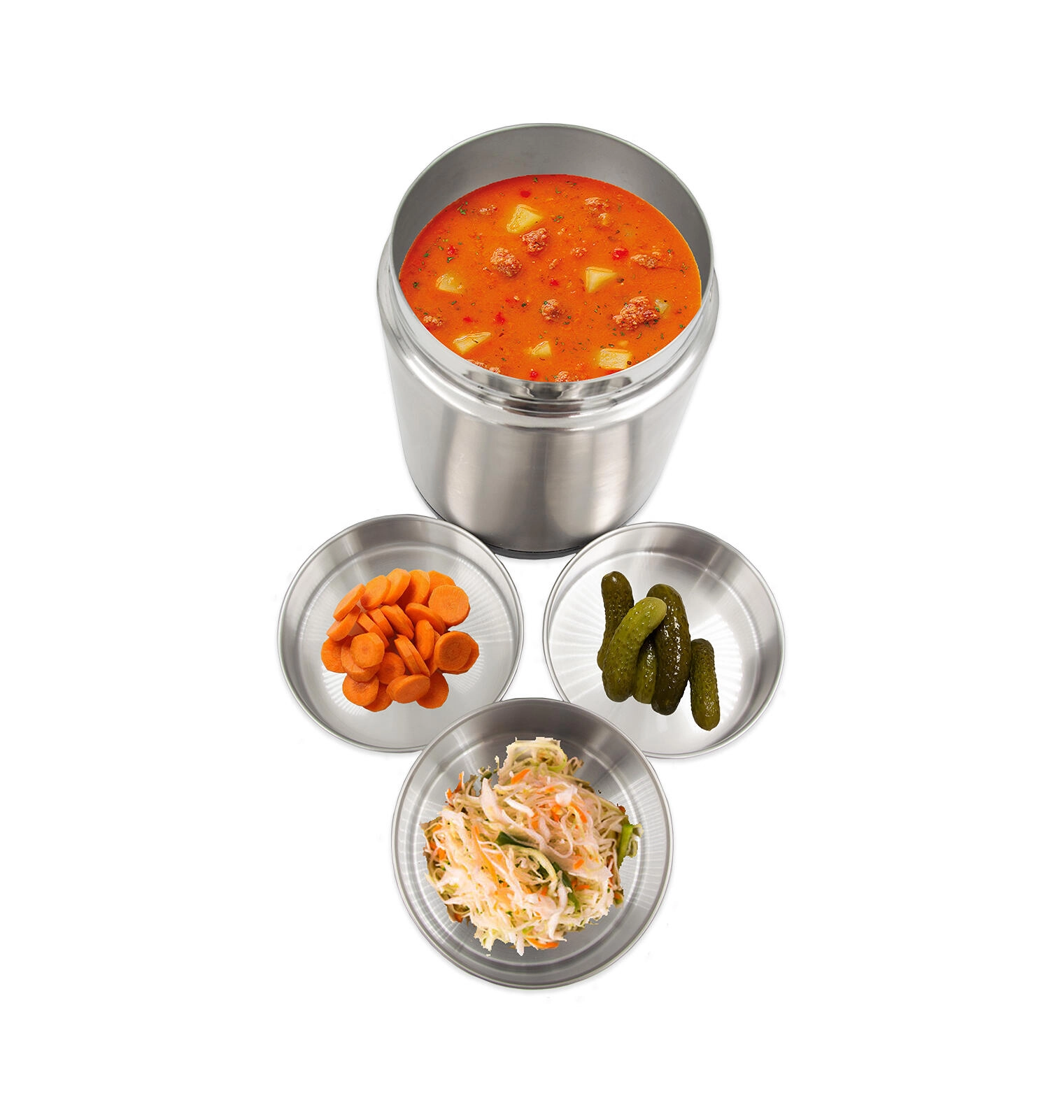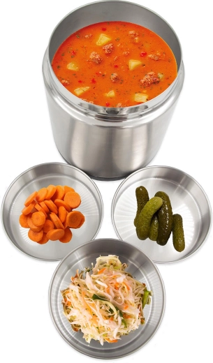 De voedselthermos met een diameter van 11 cm combineert duurzaam roestvrij staal met praktische kunststof elementen. Binnenin bevinden zich drie afzonderlijke bakjes – twee van 0,25 l en één van 0,5 l – elk met een kunststof, lekdicht deksel. Dit maakt het mogelijk om verschillende gangen veilig te scheiden, de versheid te bewaren en gemakkelijk te serveren. De buitenste kunststof bodem dempt geluid bij het neerzetten en de robuuste handgreep vergemakkelijkt het dragen.