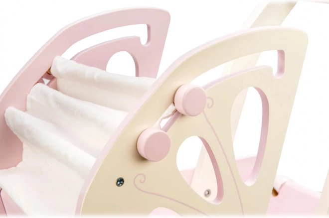 Comfort voor poppen en knuffels dankzij het zachte bedje en de stoffen hemel voor stijlvol “slapen” onderweg.