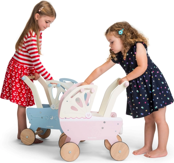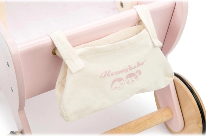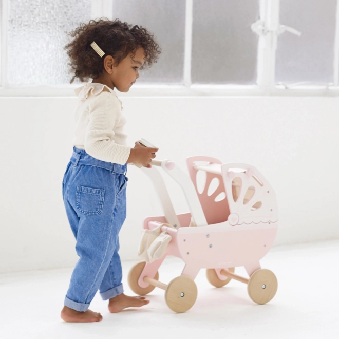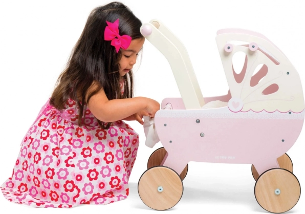 Stijlvolle houten poppenwagen Sweet Dreams van LE TOY VAN in pastelroze, met een traditionele uitstraling en hoogwaardige afwerking. Biedt een stevige constructie, een zacht matras, een met de hand genaaide uitschuifbare hemel en stille rubberen wielen voor soepel rijden op zowel tapijt als harde vloeren. Inclusief een schattige luiertas. Ethisch geproduceerd van FSC-hout en geverfd met niet-giftige verf.