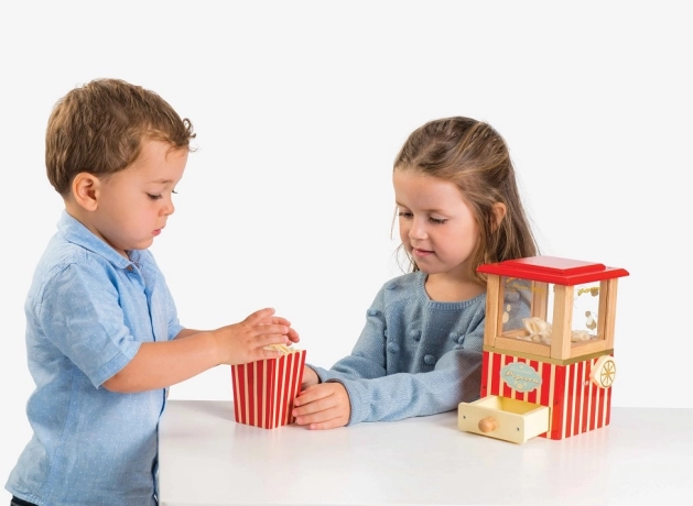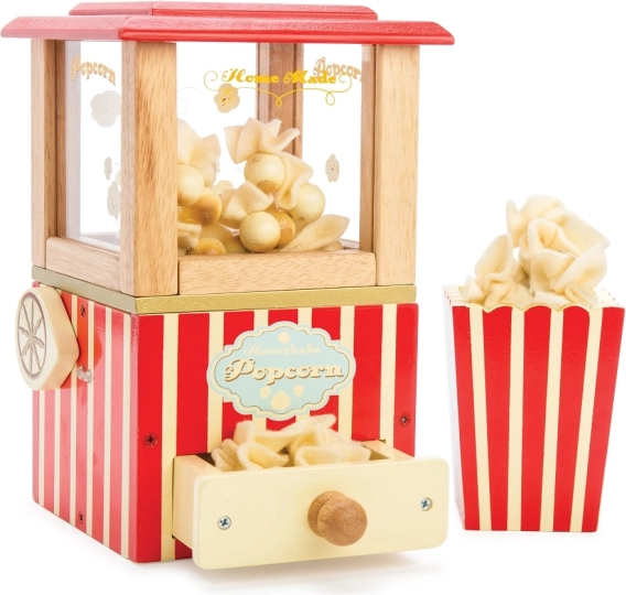 Stap in de wereld van bioscoopspel met deze gedetailleerde popcornmaker die elke kinderkamer laat stralen. De combinatie van hoogwaardig massief hout, een werkende hendel voor “poffen” en accessoires zoals vilten popcornstukjes, een lade en een gestreept bakje, trekt kinderen urenlang in het spel. Er zijn ook bioscooptickets en kaartjes voor zoete/zoute popcorn voor nog rijker rollenspel.