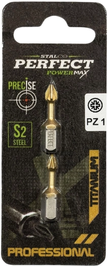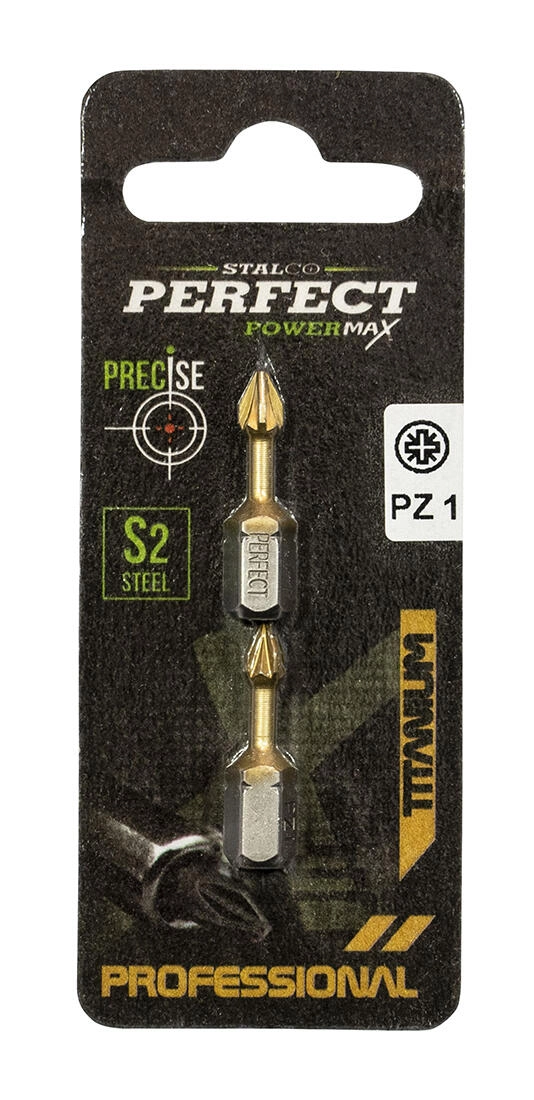 Kwalitatieve titanium Pozidriv-bit PZ1 met een lengte van 25 mm van het merk STALCO, bedoeld voor nauwkeurig schroeven met accuschroevendraaiers. Biedt hoge duurzaamheid, lange levensduur en betrouwbare krachtoverbrenging. De praktische verpakking bevat 2 stuks in blister.