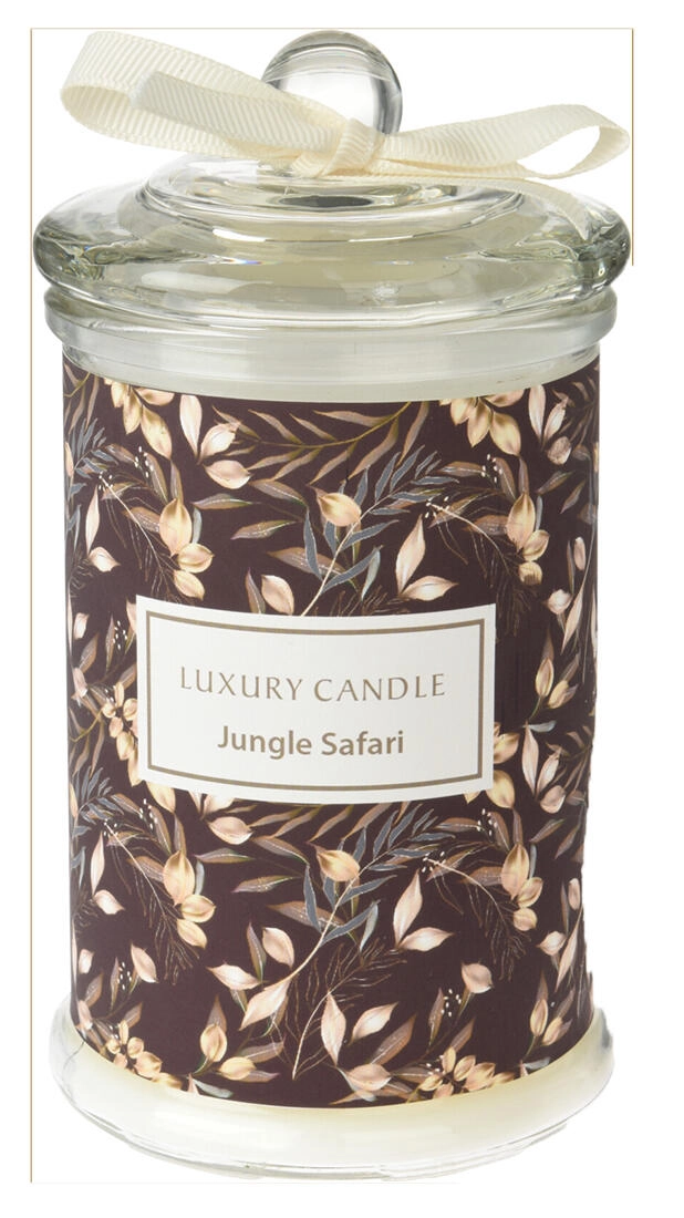 De heldere glazen pot met decoratieve print en strik oogt elegant en beschermt de kaars tegen stof wanneer deze niet in gebruik is.