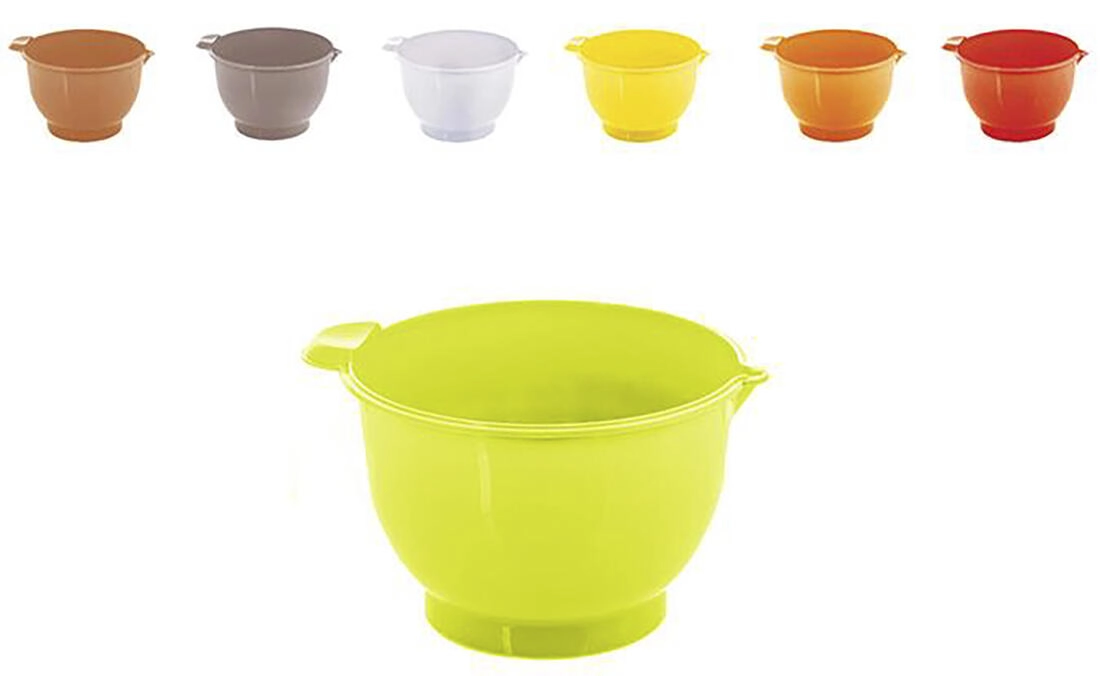 De geïntegreerde tuit maakt nauwkeurig en schoon overgieten van beslag of crèmes in de vorm eenvoudig. Het duurzame plastic is gemakkelijk te onderhouden en de kom is licht en prettig hanteerbaar. Wordt geleverd in een mix van kleuren, zodat hij in elke keuken past.