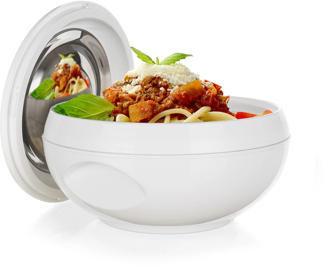 De dubbele wand met PUR-schuim en roestvrijstalen inzet houdt eten langer warm of koud – zonder extra opwarming.