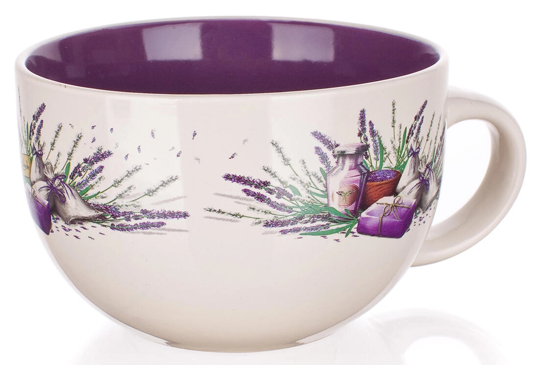 Stijlvolle jumbo mok met lavendelmotief en een inhoud van 660 ml, perfect voor dagelijks gebruik. Biedt een tweekleurige glazuur, comfortabel drinken dankzij de brede diameter van 13 cm en is geschikt voor magnetron en vaatwasser voor eenvoudig onderhoud.