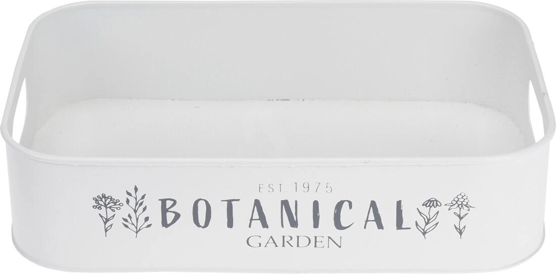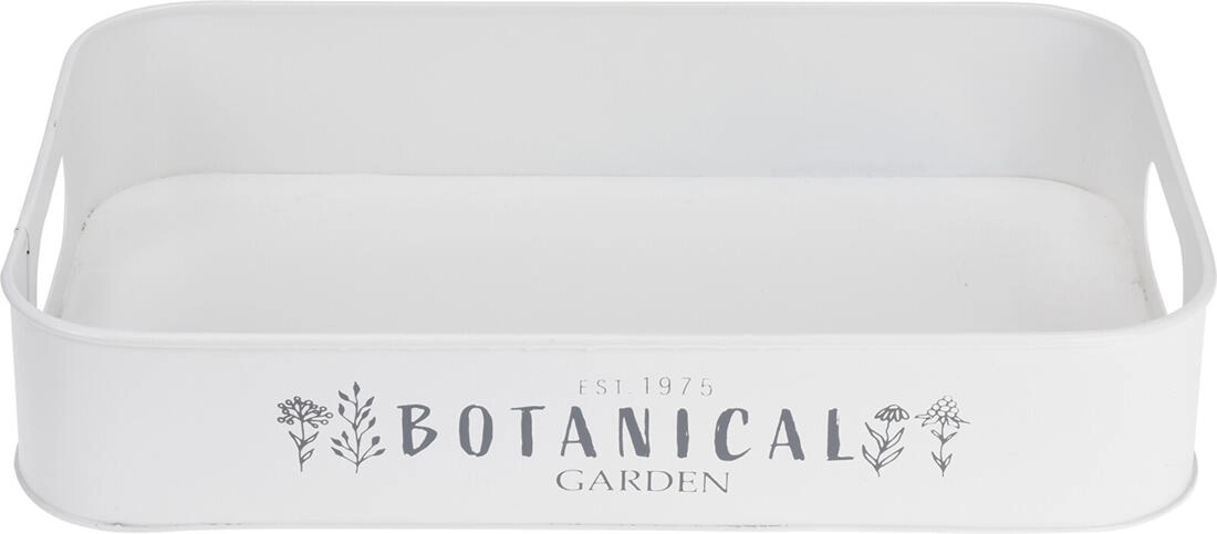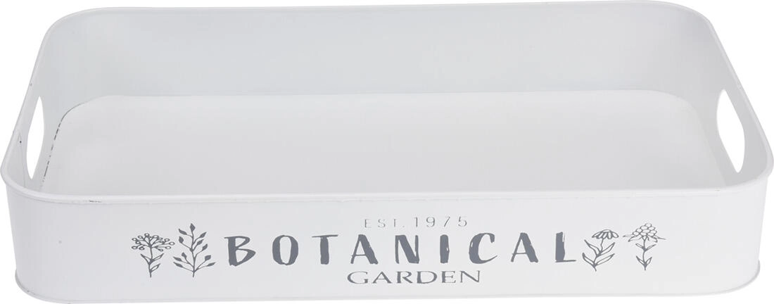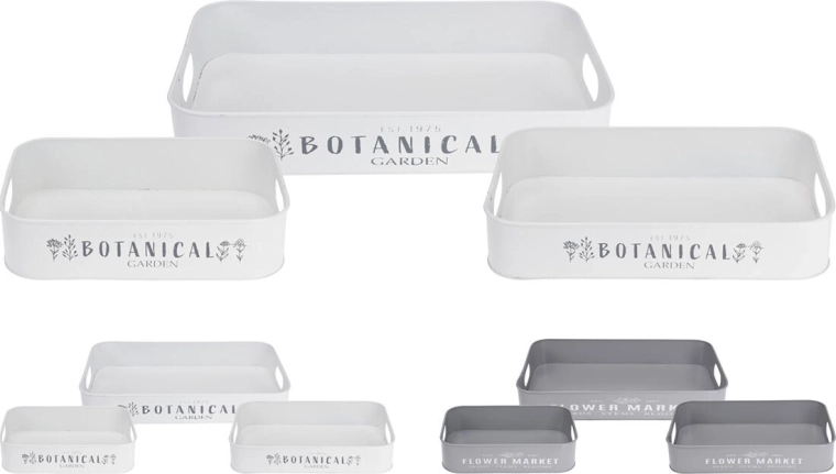 Stijlvolle set van drie metalen dienbladen in wit en grijs met een subtiele tuinprint voor dagelijks gebruik en decoratie. Dankzij de verschillende afmetingen en praktische handgrepen aan de zijkant zijn ze perfect voor serveren, organiseren en het decoreren van interieur en tuin. De duurzame metalen constructie zorgt voor een lange levensduur en eenvoudig onderhoud.